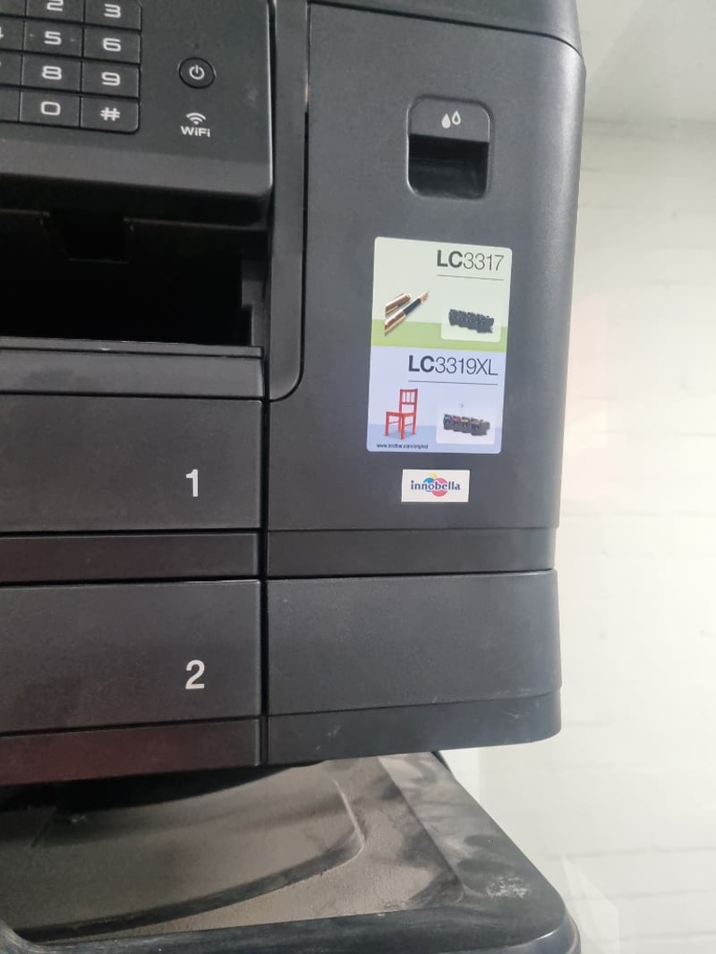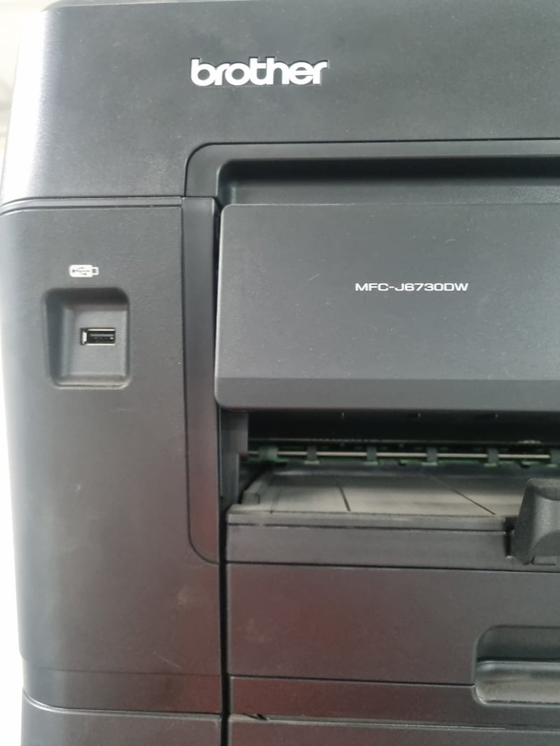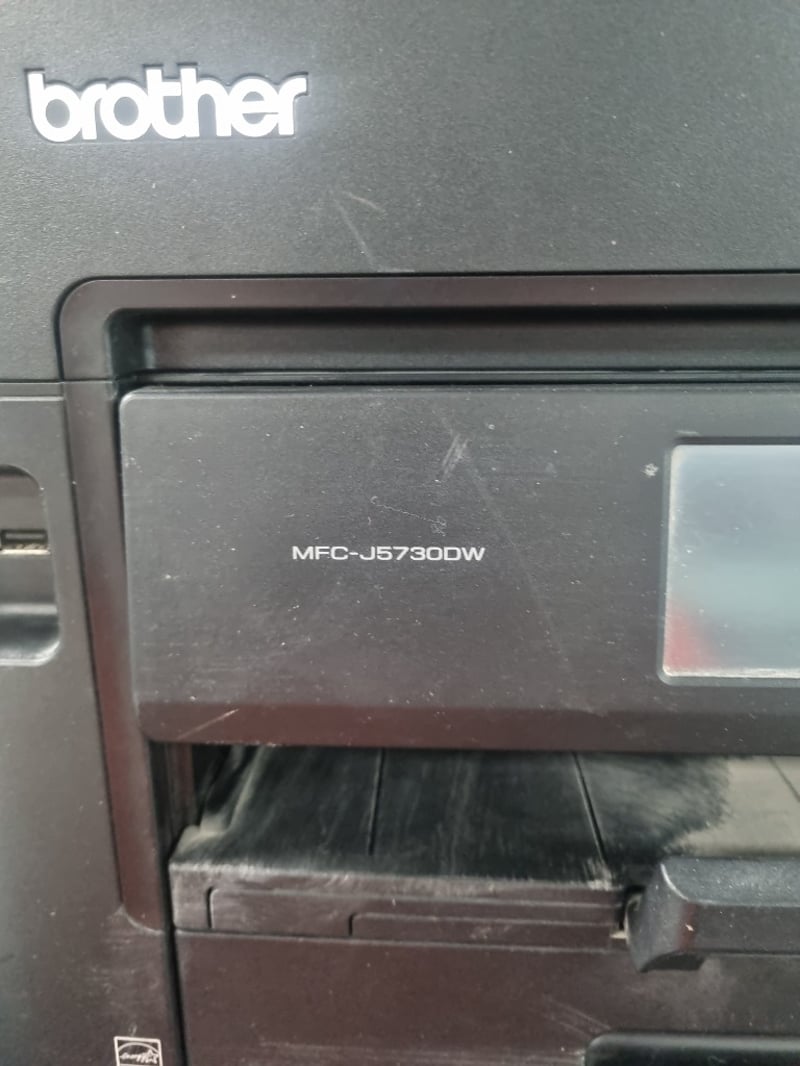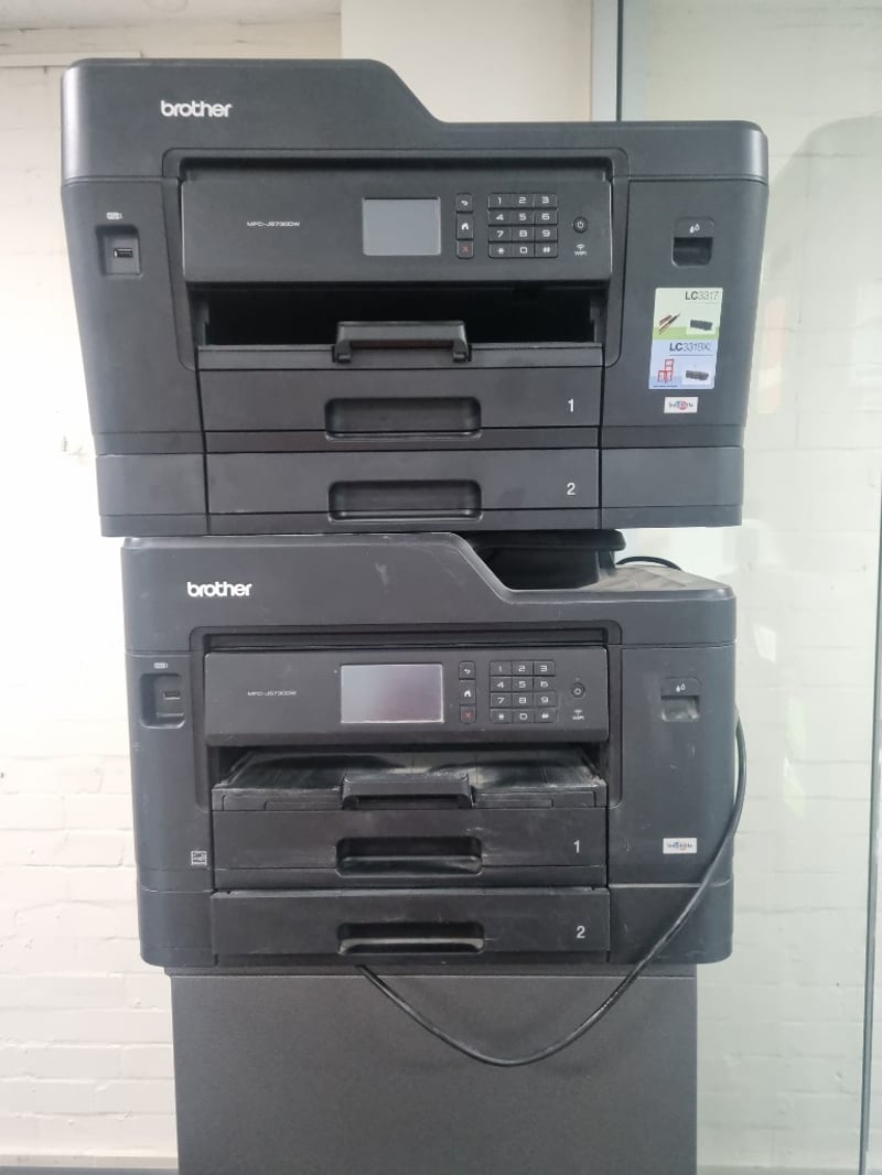 Two Brother multifunction printer units stacked together. Top unit is a Brother MFC-J6730DW inkjet multifunction printer with dual paper trays (labeled 1 and 2), featuring automatic document feeder, touchscreen display, and WiFi connectivity. Bottom unit is a Brother MFC-J5730DW inkjet multifunction printer, also equipped with dual paper trays and WiFi capability. Both devices feature Innobella ink system compatibility (LC3317 and LC3319XL cartridges noted).Sold as lot Note: Items may be new, used, or untested, and their condition or functionality is not guaranteed.