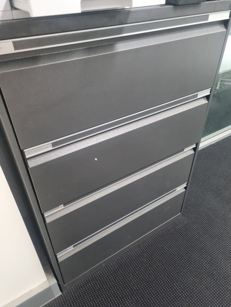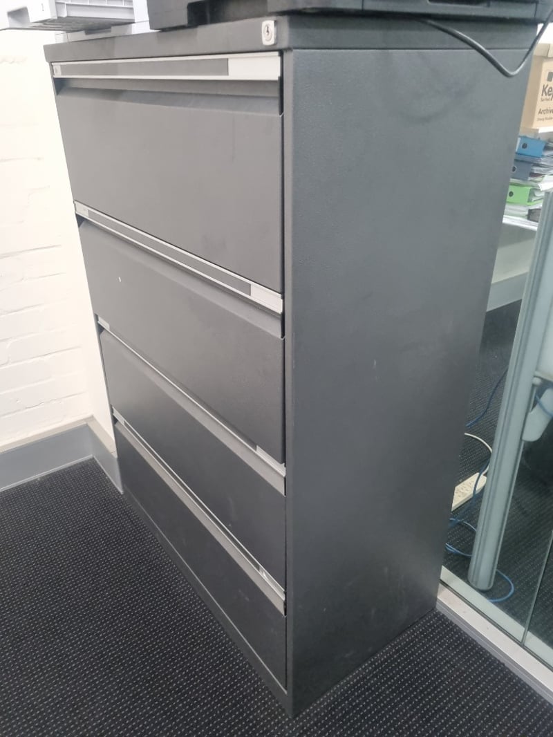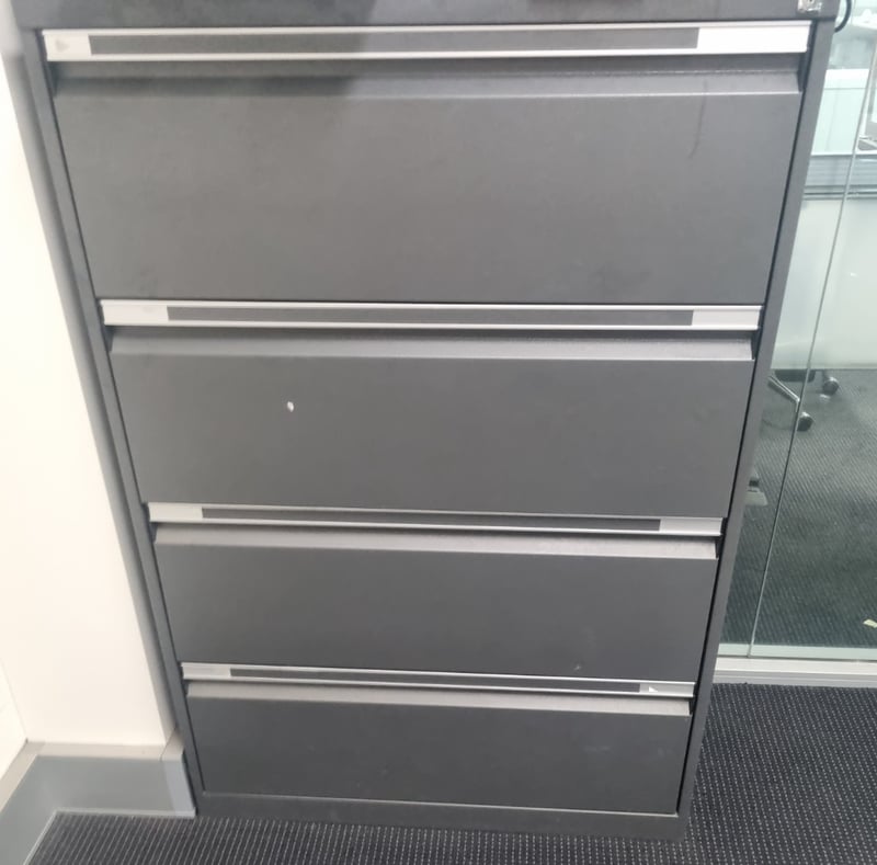 Grey metal lateral filing cabinet with 4 drawers featuring chrome handles and trim.Drawers have label holders for organization. Cabinet features a sturdy steel frame construction with a powder-coated grey finish.