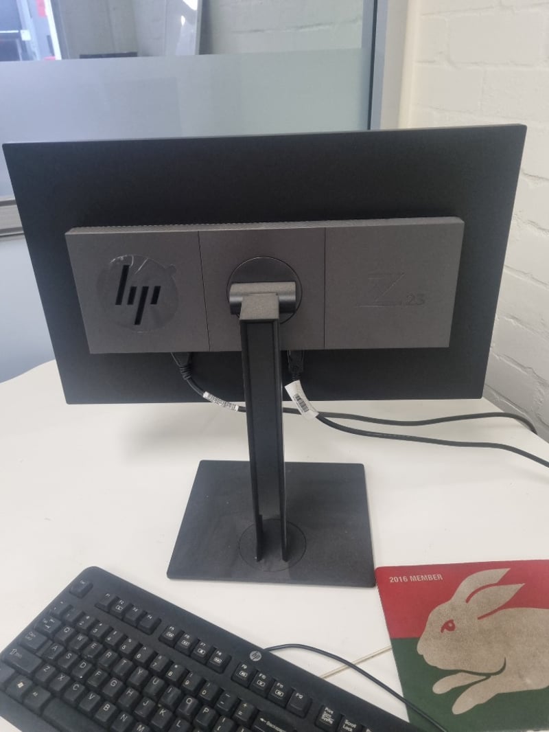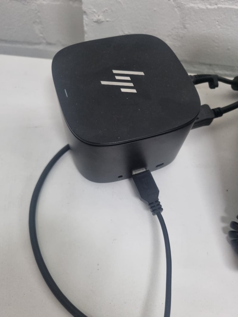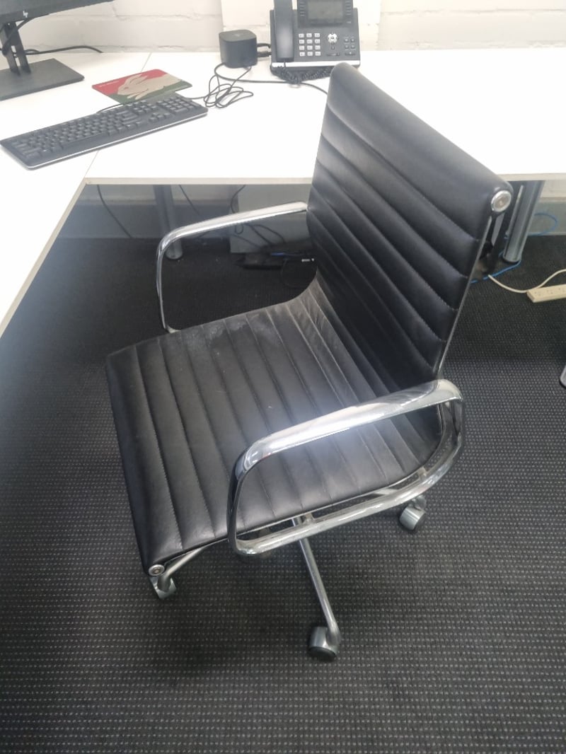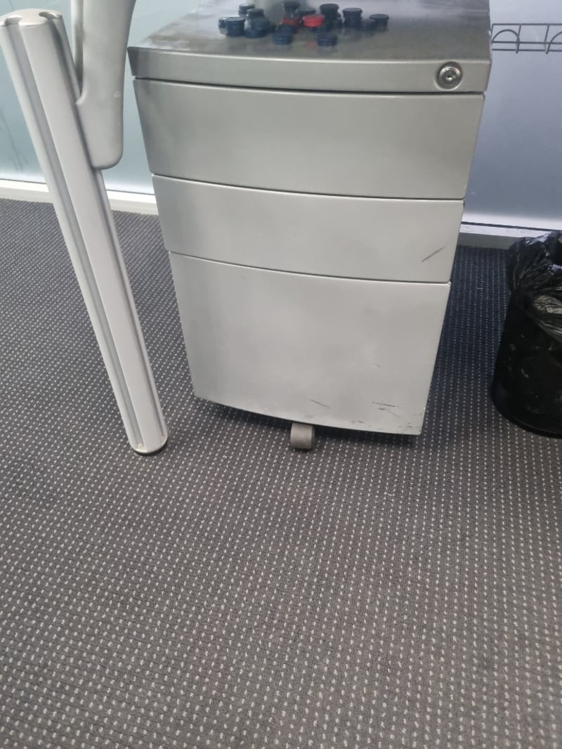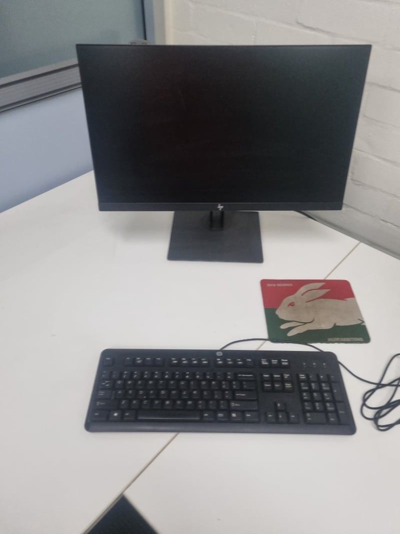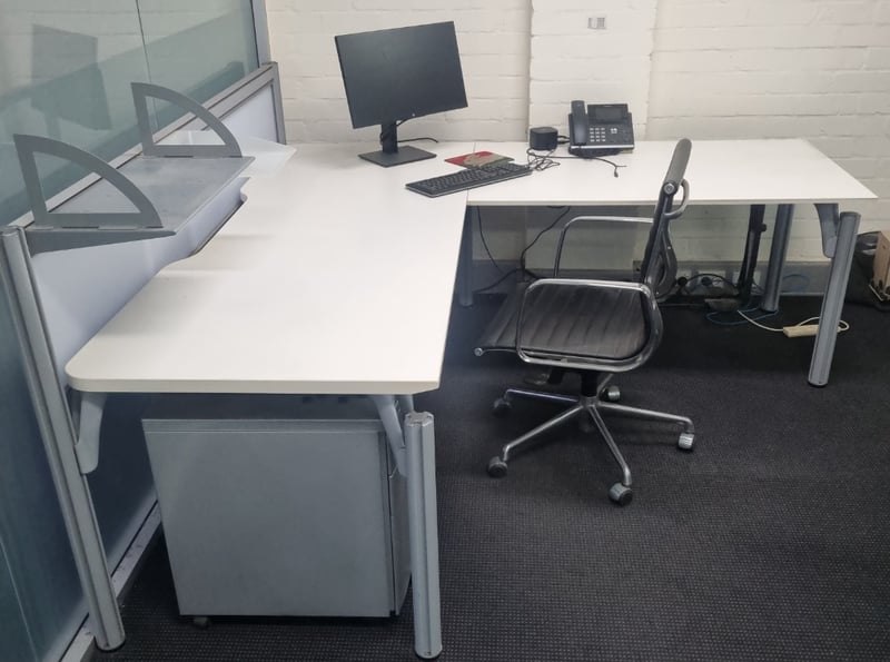 Comprehensive office furniture and equipment lot comprising multiple workstations. Includes white modular desks with cable management, black ergonomic office chairs with ribbed leather upholstery and chrome frames, adjustable monitor stands, HP commercial monitor, full-size keyboard and mouse setup, VoIP telephone system, mobile pedestal filing cabinet in light grey with locking mechanism. ( no key) Note: Items may be new, used, or untested, and their condition or functionality is not guaranteed.