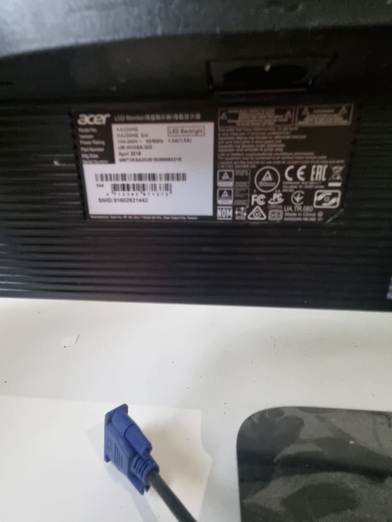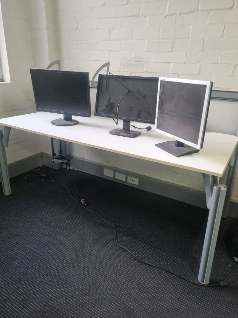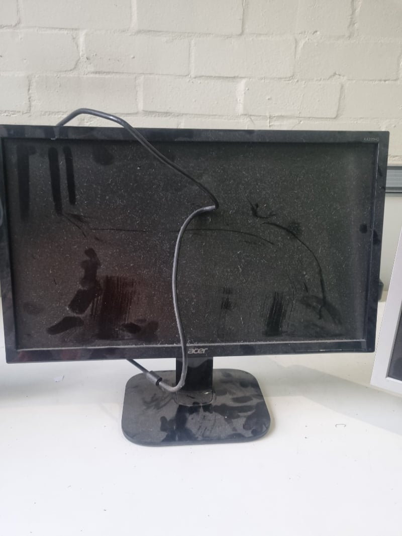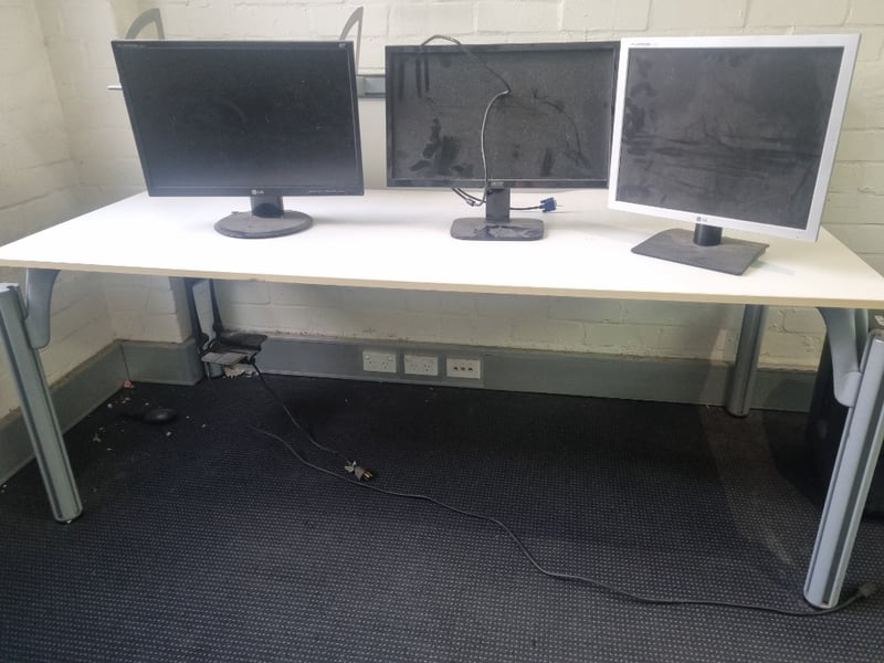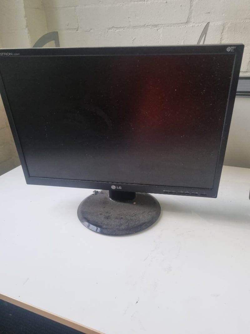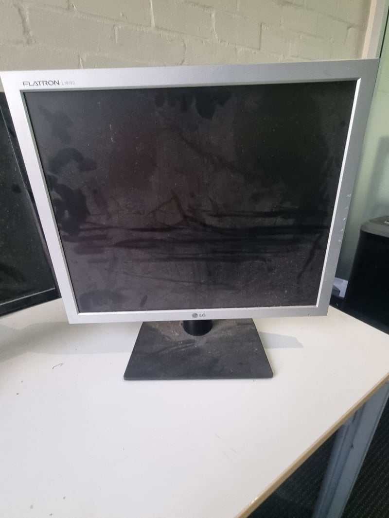 Lot comprising three computer monitors suitable for multi-screen setup or individual use. Includes LG Flatron L225WT (22-inch white bezel model), LG Flatron L1919S-SF (19-inch black model), and Acer monitor (specifications visible on rear panel). All units feature standard VGA connectivity with blue connectors visible, white large desk included.