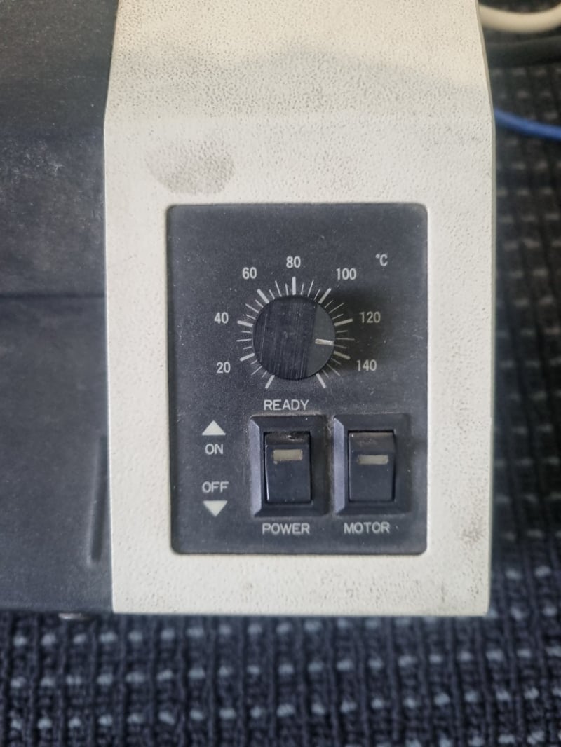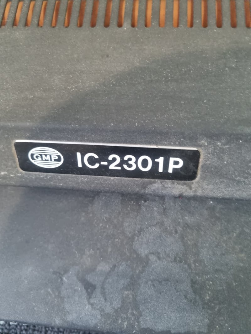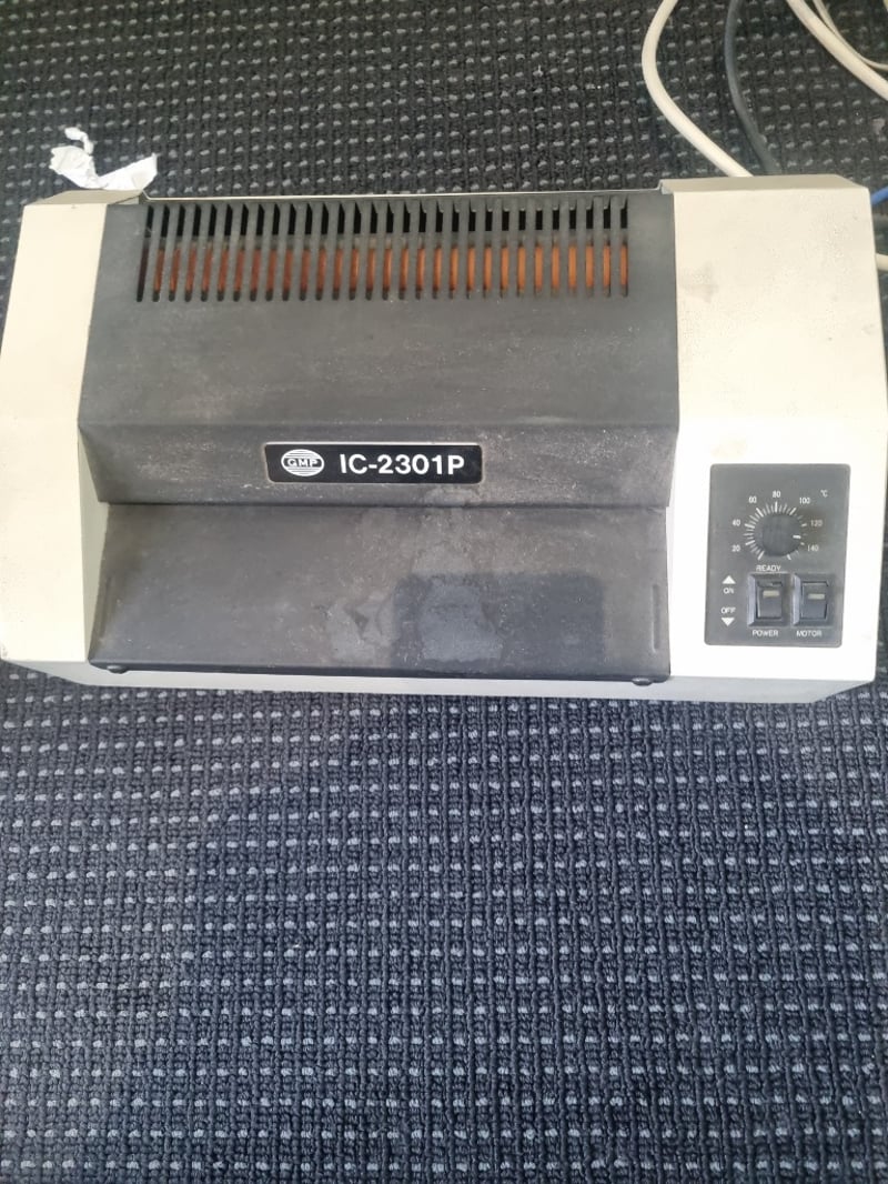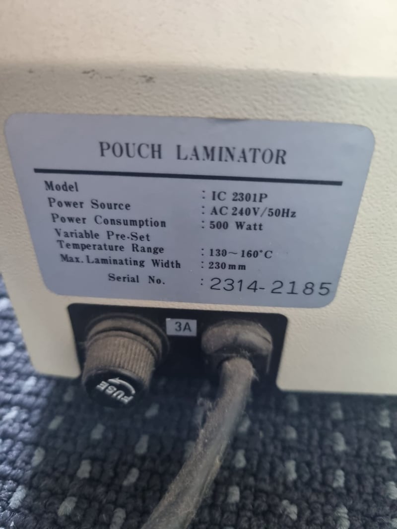 CMP IC-2301P pouch laminator in white and dark grey casing. Features variable temperature control (130-160°C) with analog dial, ON/OFF switches, POWER and MOTOR buttons, and "READY" indicator. Maximum laminating width 230mm. Heating element with orange heating fins visible. AC 240V/50Hz powered, 500W consumption. Serial number 2314-2185.