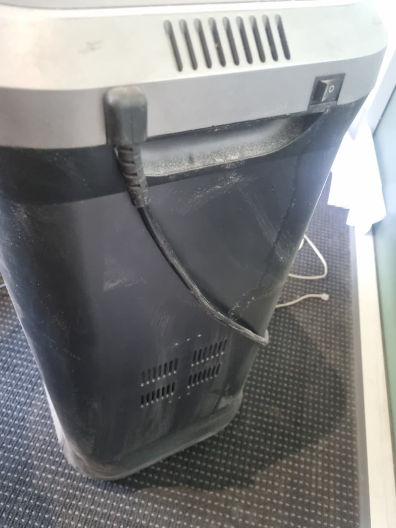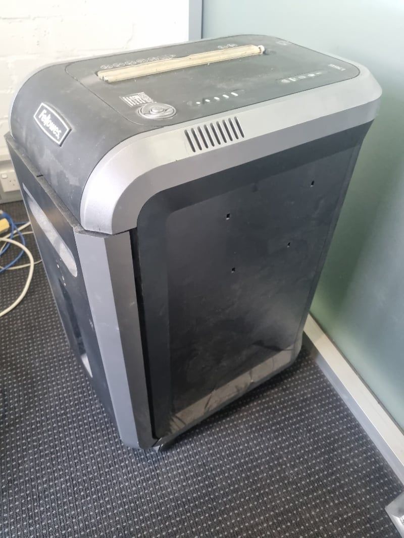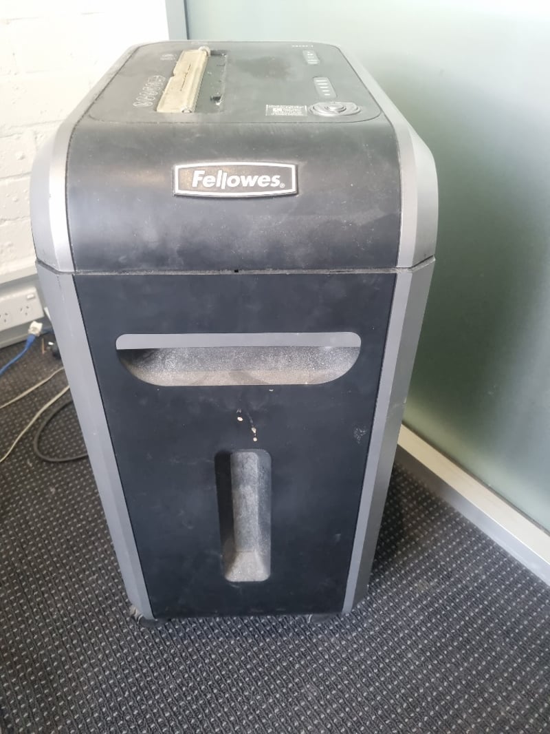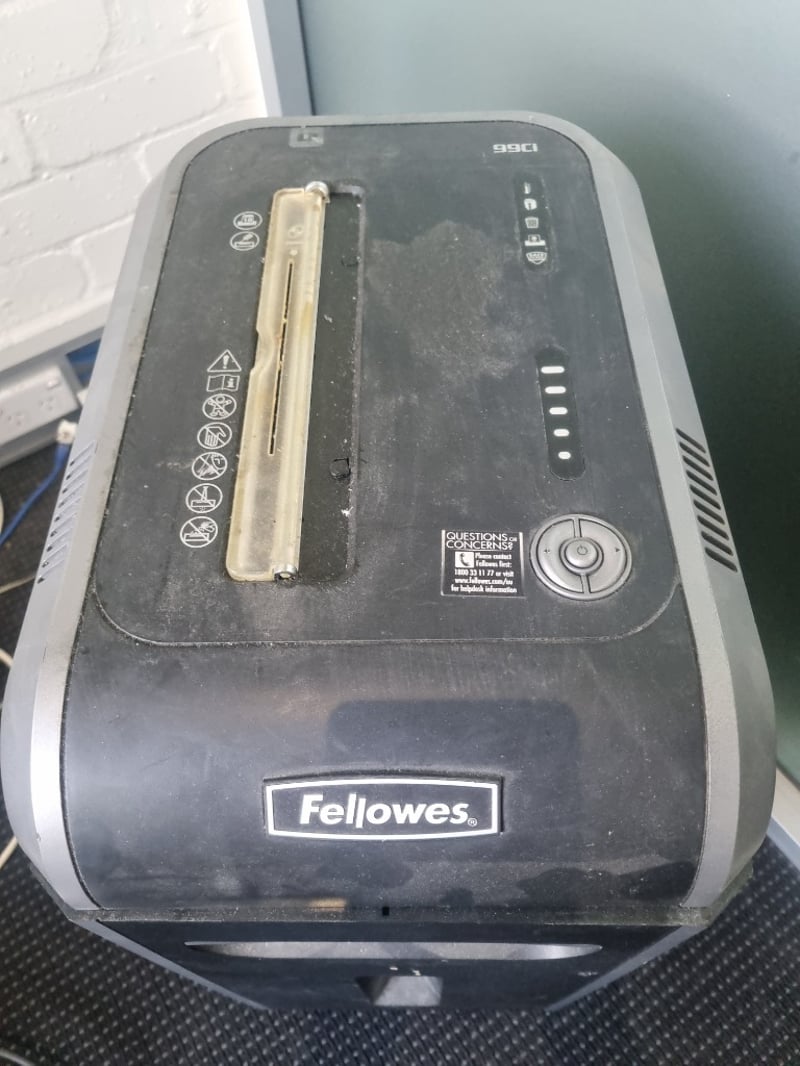 Fellowes 99Ci cross-cut paper shredder in black and silver finish. This heavy-duty office shredder features a top-loading design with manual feed mechanism and integrated waste bin. The unit displays control icons on the top panel and includes a power switch.Note: Items may be new, used, or untested, and their condition or functionality is not guaranteed.