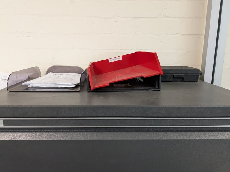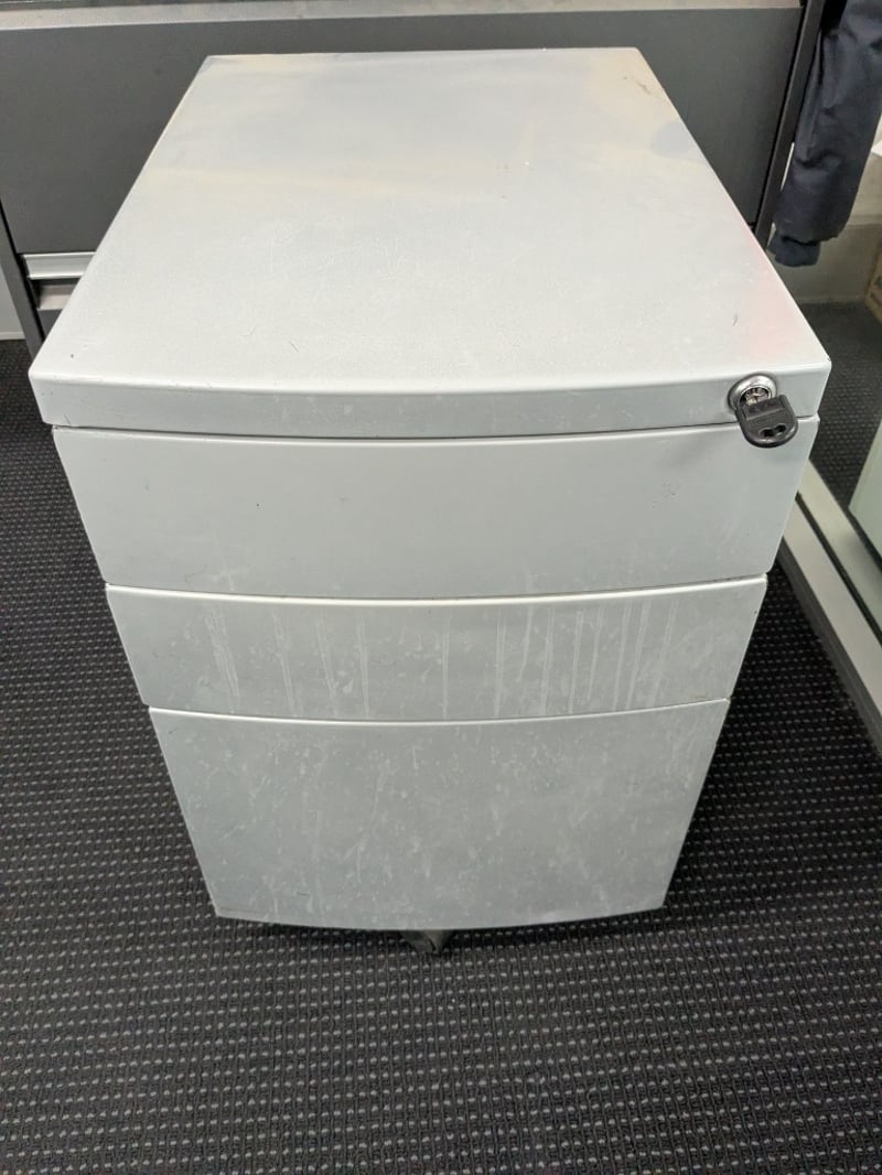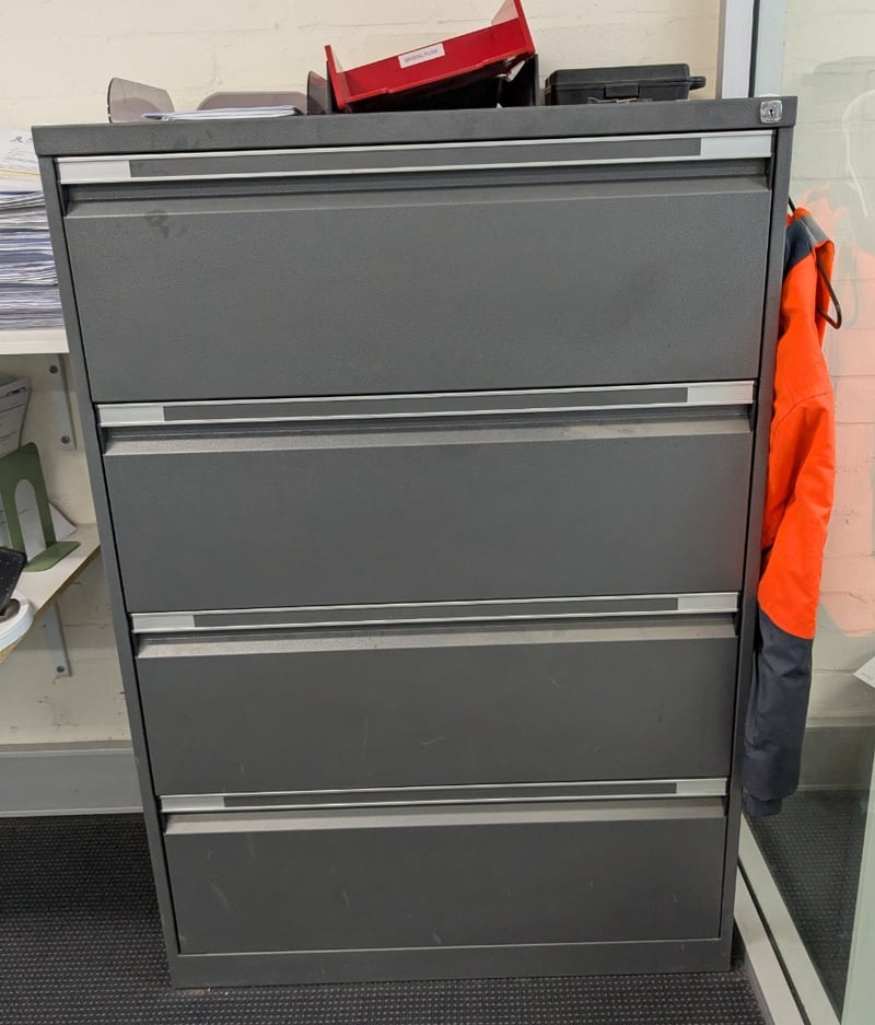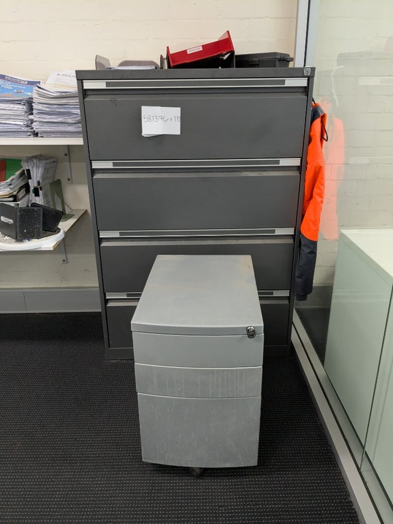 Professional 4-drawer lateral filing cabinet in charcoal grey with brushed aluminium handles and trim. Features smooth-glide drawer mechanisms with full-extension capability. Includes integrated locking system with key. Cabinet has a clean, modern design suitable for office or workshop environments. Accompanied by a white 3-drawer mobile pedestal unit on castors. Sold as lot Note: Items may be new, used, or untested, and their condition or functionality is not guaranteed.