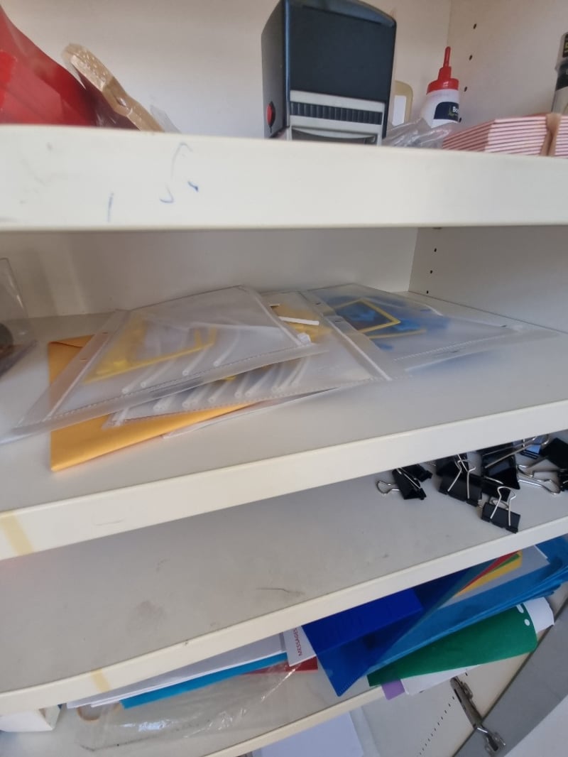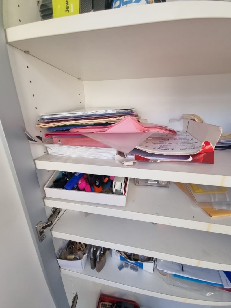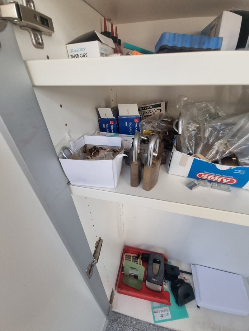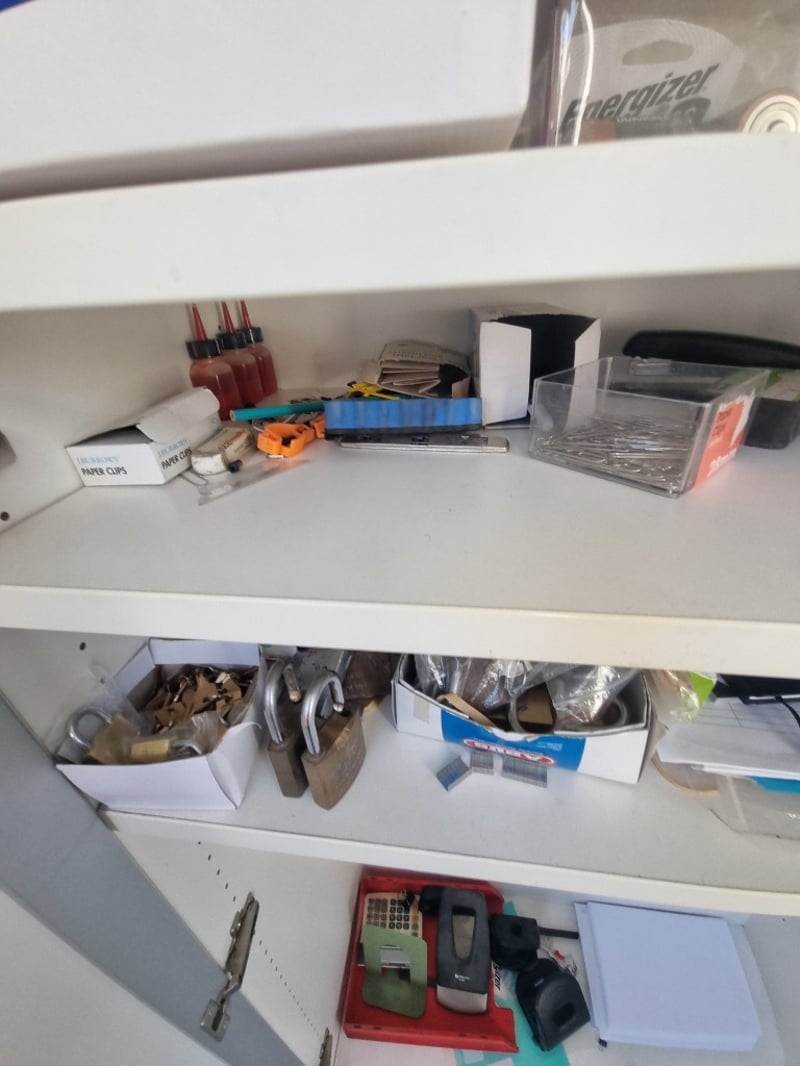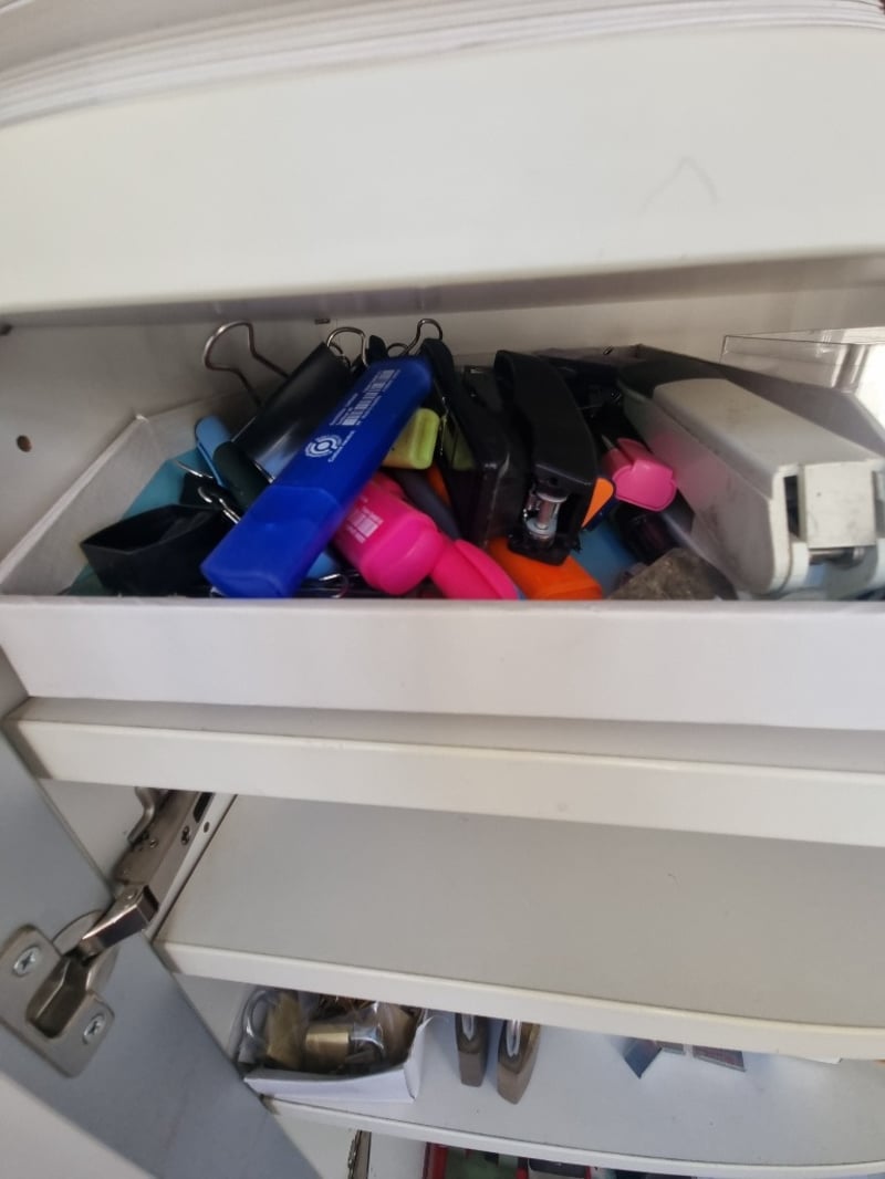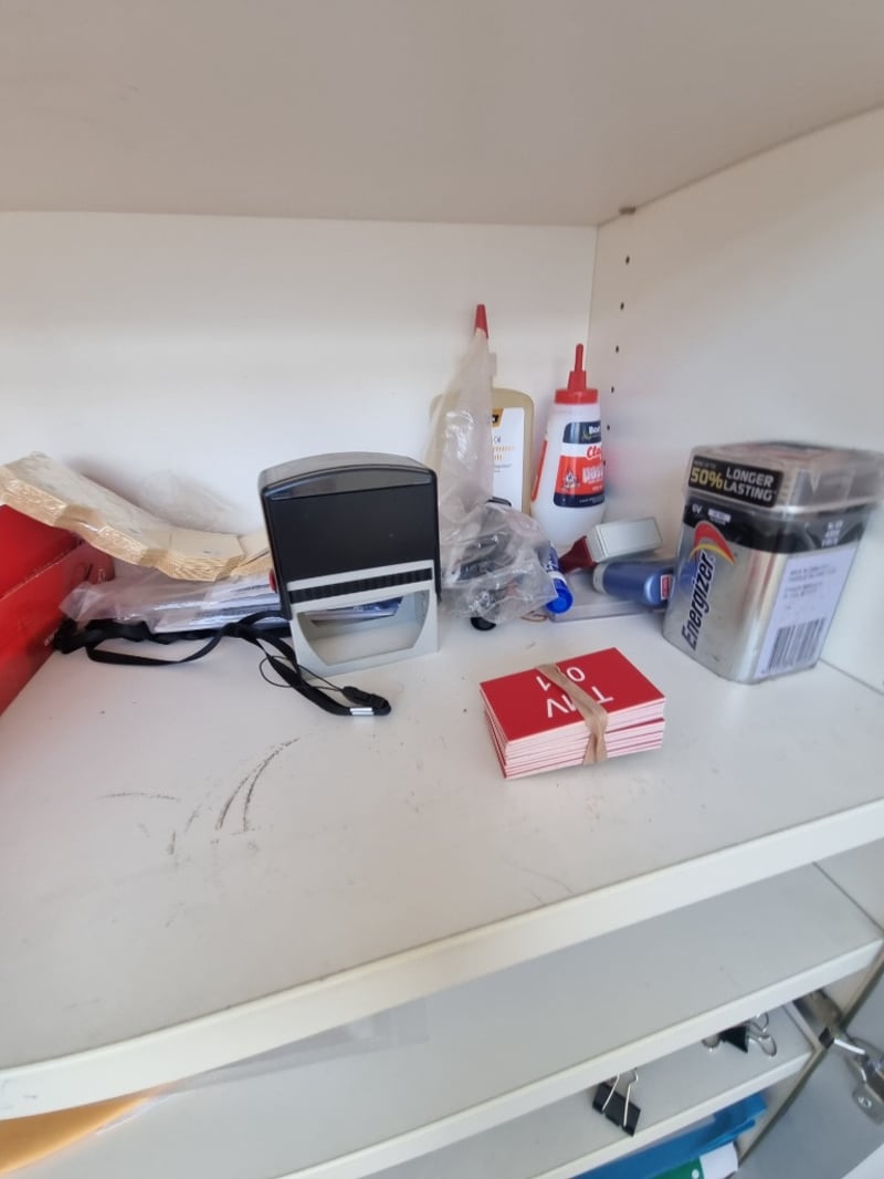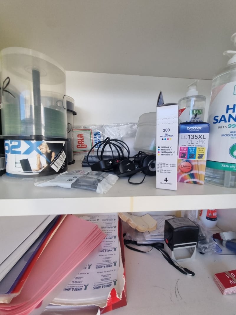 Office supplies and organizational items. Contents include printer ink cartridges (Brother LC135XL), hand sanitizer, office stationery, CD cases, adhesives, desk organizers, and more. . Sold as lot Note: Items may be new, used, or untested, and their condition or functionality is not guaranteed.
