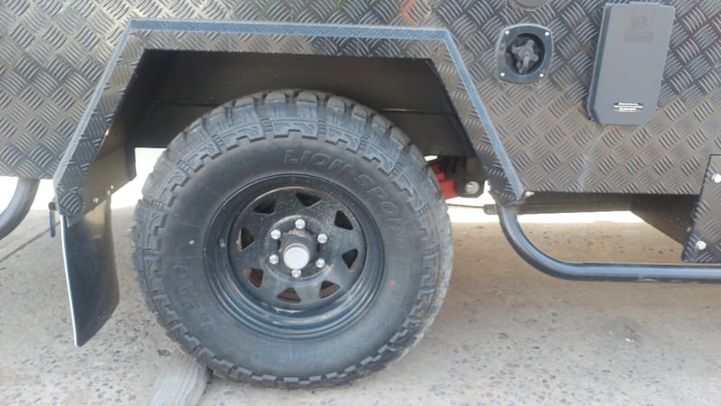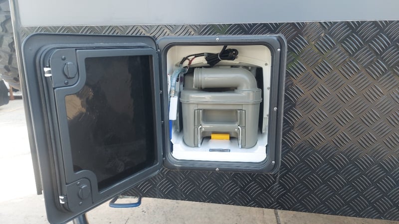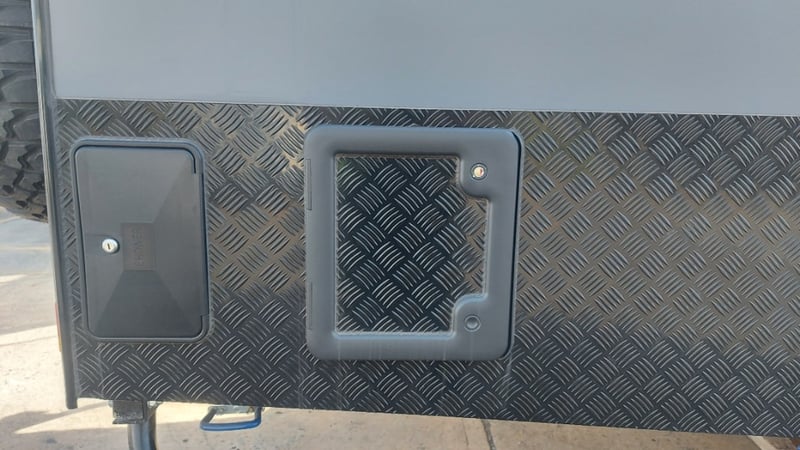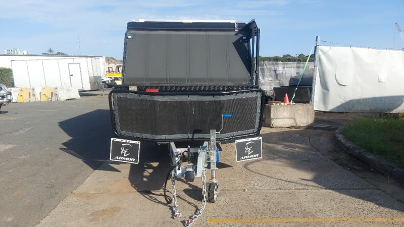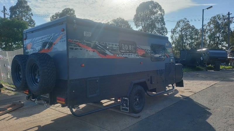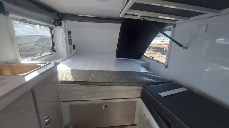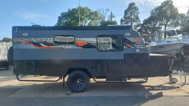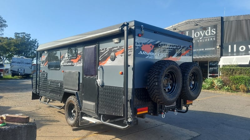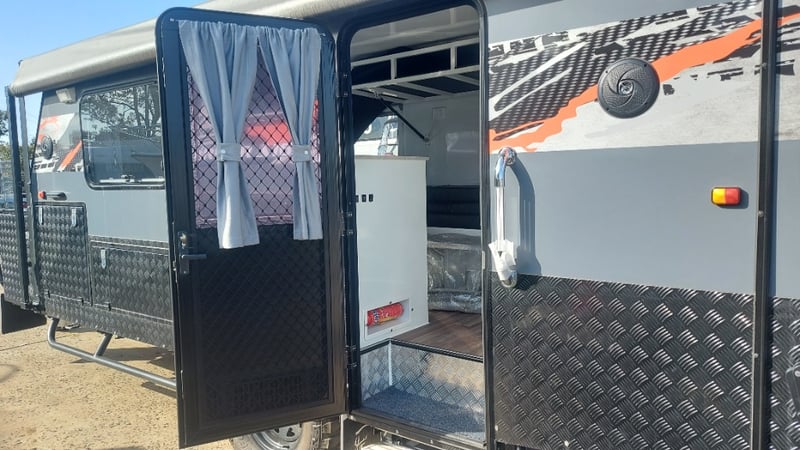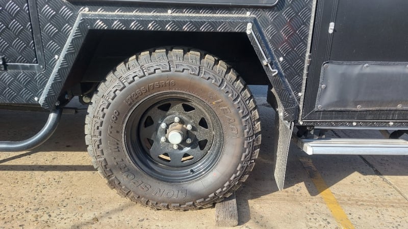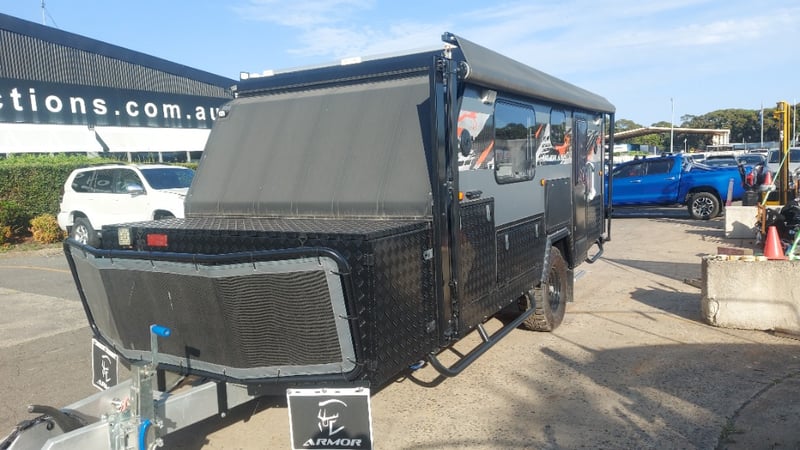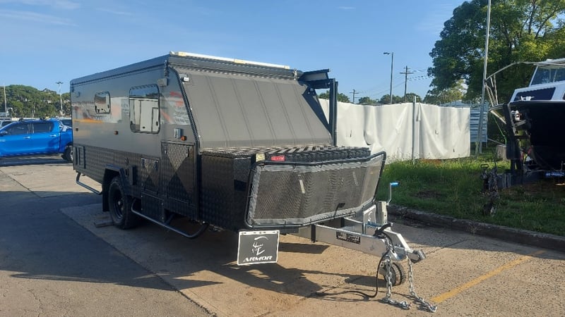 Description/ extras: Size: 6750 L x 2180 W x 2450 H mm, Draw-bar: Total Draw-bar size: 3600mm (3700 mm include coupling), Chassis: Extra Heavy Duty off-road frame, Suspension: Coil spring, twin shock absorbers, independent trailing arm, wheels and Tyres: 4 x Alloy Wheels, 2 x Brand New Spare 16” 6-stud Land-cruiser, pattern tyres and rims (265/75R16), Brakes: 12-inch, electric Brakes plus additional Hand Brake, Coupling: Off-road Heavy-Duty coupling with double safety chains, Finish: Hot-Dip Galvanized steel frame, Jockey Wheel: Heavy duty steel, Includes: 2 x Jerry can holders, Water tank: 180 L, Waste water tank: 120L, 2 x Gas bottle holders (9 KG bottles), Bedding area: LED Lights with Switch, Lights: Built-in LED Lights (internal & external), Solar Panel: 200W Roof mounted solar panel, Electric: 2000w inverter, 30A charger .240v inlet and Australian standard wires, air condition, truma water heater, Stabilizer legs: 4 x quick lock-up and wind down drop-down stabilizer legs, tent Description: Awning Colour: Grey, Awning Section: 4200 x 2250 mm, Annex Section: 4200x 2250 mm, Canvas: 16oz Heavy duty (100% waterproof) double stitched canvas, Height (lowest): 2120 mm, Height (highest): 2760 mm, Mattress: 2000 L x 1500 W mm (inner spring), Windows: Midge mesh Mosquito Proof Netting on all windows and doors, Mounting System: Gas Strut / Hinge system, Other inclusions: Guide ropes, pegs, poles, annex walls, annex roof, Other features: self Supporting Modern Design – Free stands without guide ropes (except in windy or extreme condition), Easy electric roof enables easy setup, Annex has removable sides, Annex Walls are Velcro Fitted & Zipped to Roof and floor Allowing for Easy Removal, High Strength Frame