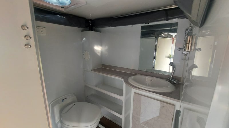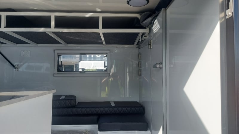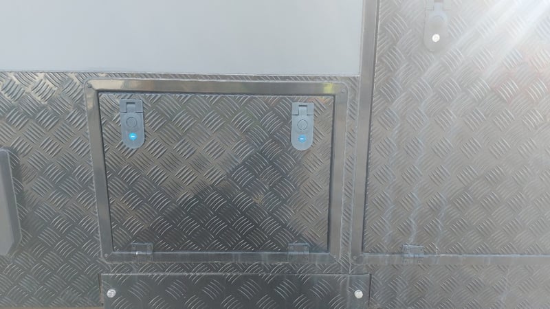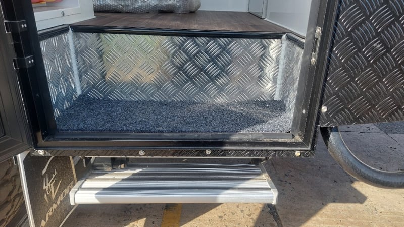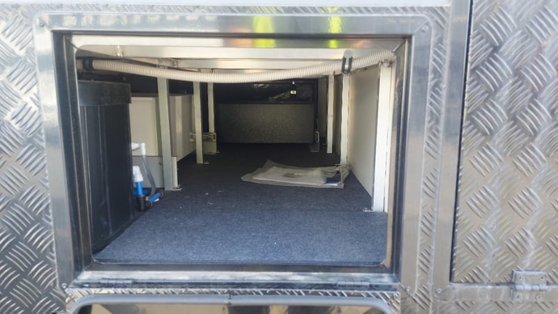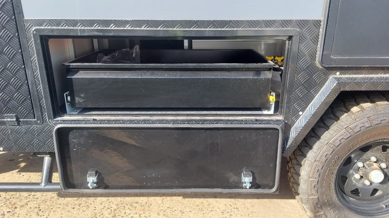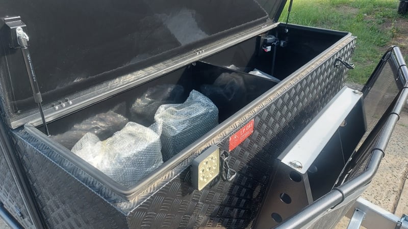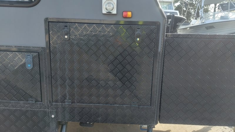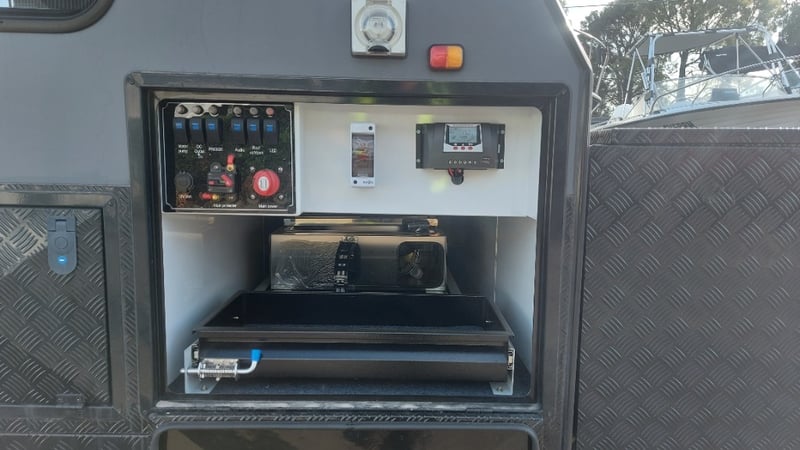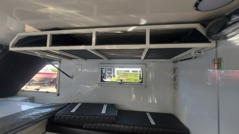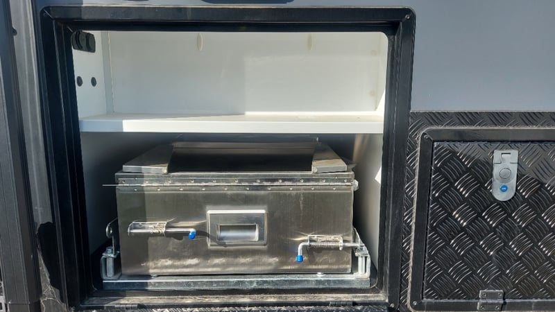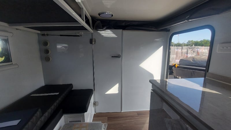 Description/ extras: Size: 6750 L x 2180 W x 2450 H mm, Draw-bar: Total Draw-bar size: 3600mm (3700 mm include coupling), Chassis: Extra Heavy Duty off-road frame, Suspension: Coil spring, twin shock absorbers, independent trailing arm, wheels and Tyres: 4 x Alloy Wheels, 2 x Brand New Spare 16” 6-stud Land-cruiser, pattern tyres and rims (265/75R16), Brakes: 12-inch, electric Brakes plus additional Hand Brake, Coupling: Off-road Heavy-Duty coupling with double safety chains, Finish: Hot-Dip Galvanized steel frame, Jockey Wheel: Heavy duty steel, Includes: 2 x Jerry can holders, Water tank: 180 L, Waste water tank: 120L, 2 x Gas bottle holders (9 KG bottles), Bedding area: LED Lights with Switch, Lights: Built-in LED Lights (internal & external), Solar Panel: 200W Roof mounted solar panel, Electric: 2000w inverter, 30A charger .240v inlet and Australian standard wires, air condition, truma water heater, Stabilizer legs: 4 x quick lock-up and wind down drop-down stabilizer legs, tent Description: Awning Colour: Grey, Awning Section: 4200 x 2250 mm, Annex Section: 4200x 2250 mm, Canvas: 16oz Heavy duty (100% waterproof) double stitched canvas, Height (lowest): 2120 mm, Height (highest): 2760 mm, Mattress: 2000 L x 1500 W mm (inner spring), Windows: Midge mesh Mosquito Proof Netting on all windows and doors, Mounting System: Gas Strut / Hinge system, Other inclusions: Guide ropes, pegs, poles, annex walls, annex roof, Other features: self Supporting Modern Design – Free stands without guide ropes (except in windy or extreme condition), Easy electric roof enables easy setup, Annex has removable sides, Annex Walls are Velcro Fitted & Zipped to Roof and floor Allowing for Easy Removal, High Strength Frame