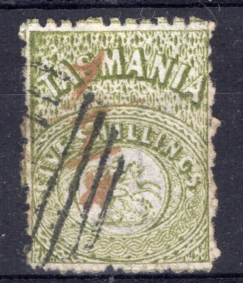 Tasmania Stamps: 5/- St George & Dragon stamp, sage green colour, 1863-1880 era, SG F24