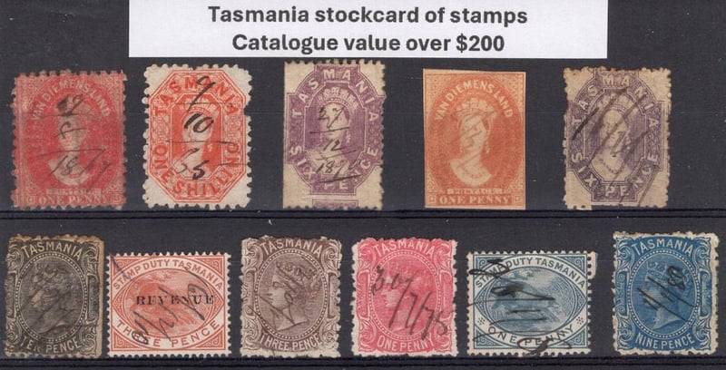 Tasmania stockcard of stamps 1866-1905 era, including 1866 imperforate Queen Victoria Chalon