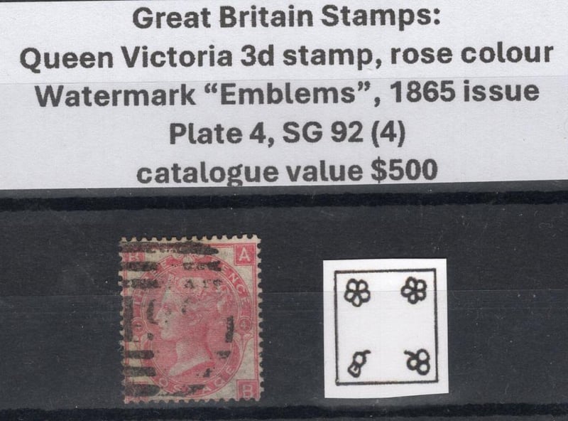 Great Britain Stamps: Queen Victoria 3d stamp, rose colour, watermark "EMBLEMS" 1865 issue, plate 4, SG 92 (4)