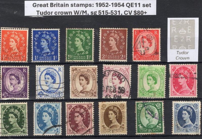 Great Britain Stamps: 1952-1954 QE11 set, Tudor Crown watermark, SG 515-531
