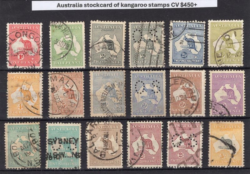 Australia stockcard of kangaroo stamps to 5/-, includes some with OS punctures, 1913-1948 era