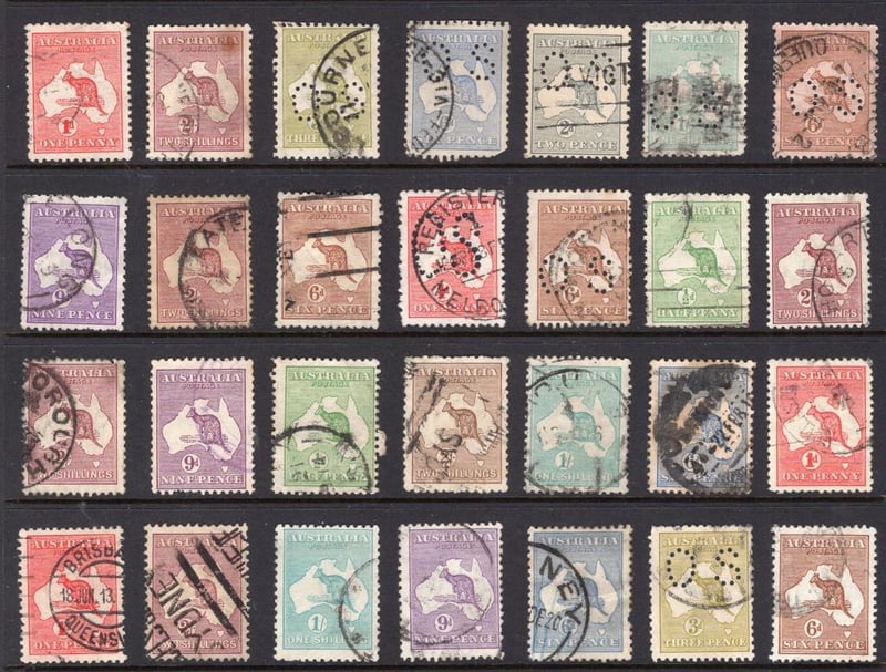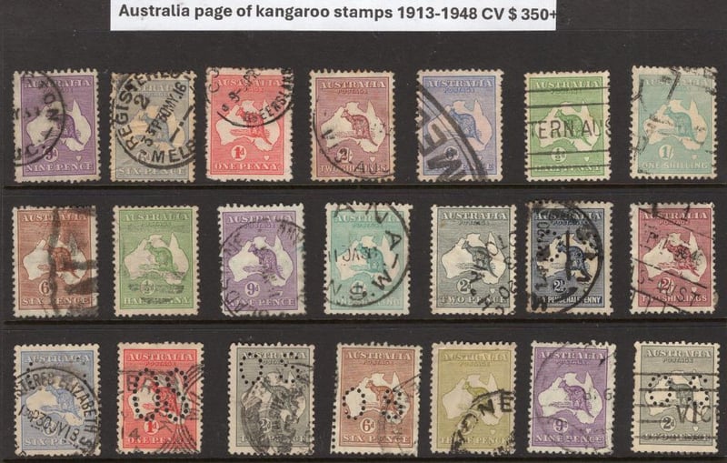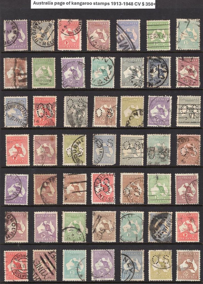 Australia page of kangaroo stamps, 1913-1948 era, includes some OS punctures