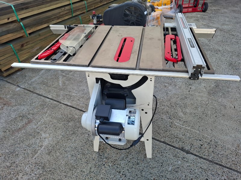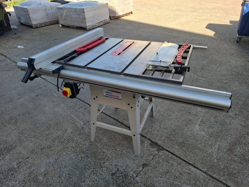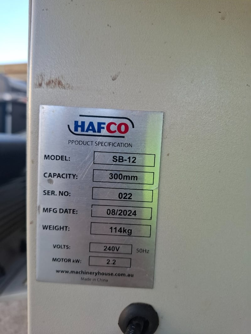 Hafco SB-12 Table Saw • Large 510 x 686mm cast iron table, 1030 x 686mm with side extensions • 100mm depth of cut at 90° • 75mm depth of cut at 45° • Dust proof magnetic switch • Tilt arbor to 45° • Powerful 2.2kw / 3hp 240V induction motor with thermal overload • Includes 100mm dust outlet, heavy duty rip fence with micro-adjustment, operated left or right of blade Includes: • Heavy duty rip fence operated left or right of blade • 305mm TCT saw blade • Push stick