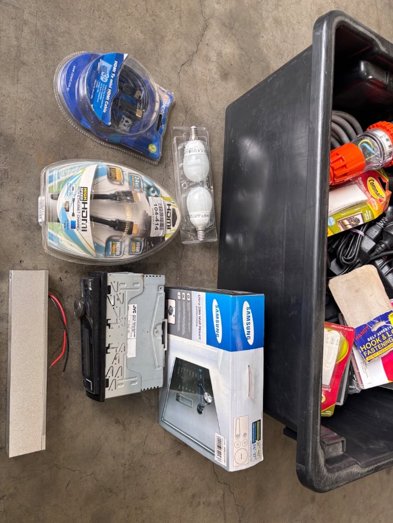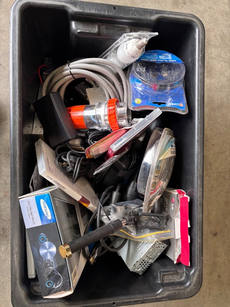 Assorted lot of electrical goods including Hdmi cables, Lightbulbs, Car Radio and MoreNote: working condition unknown, Sold as Lot