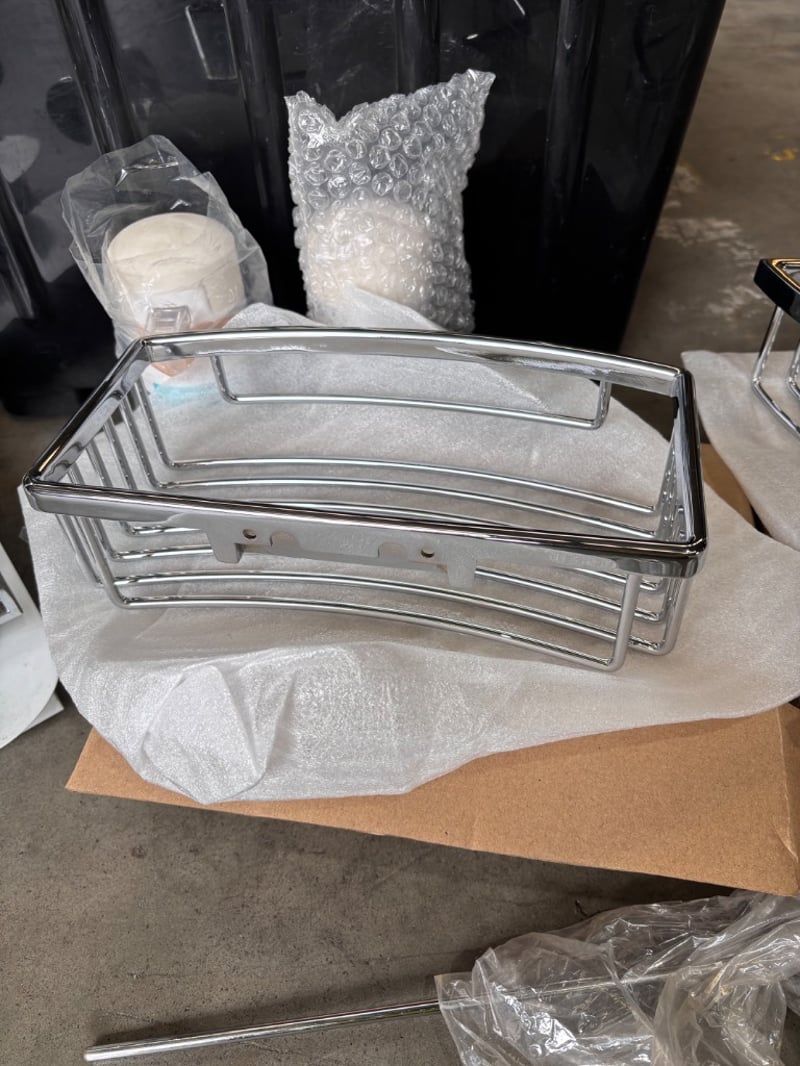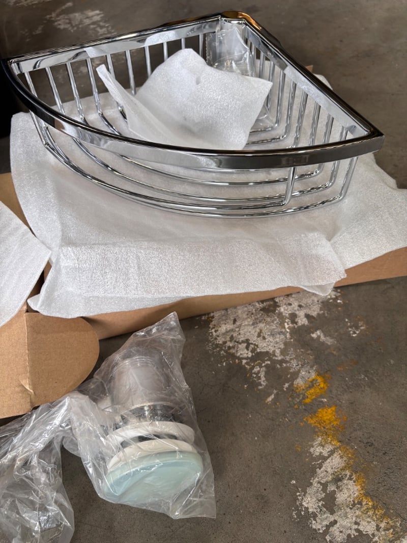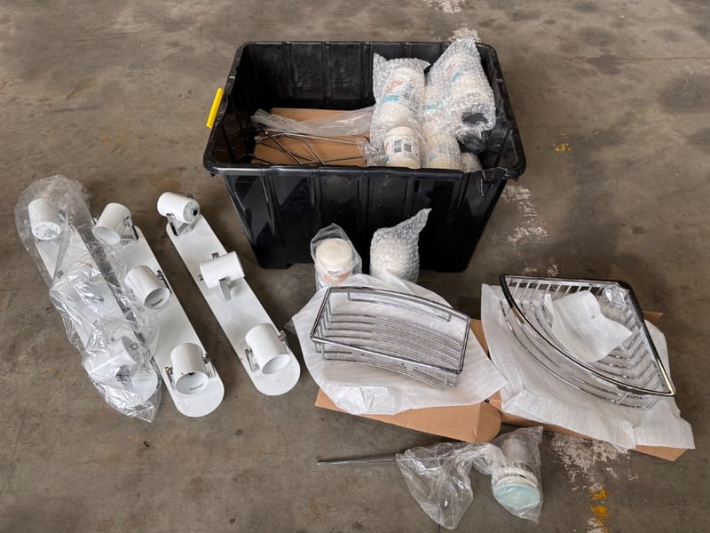 Assorted Lot Of Bathroom And Renovation Supplies including Lights and shower caddies Note: Sold as Lot