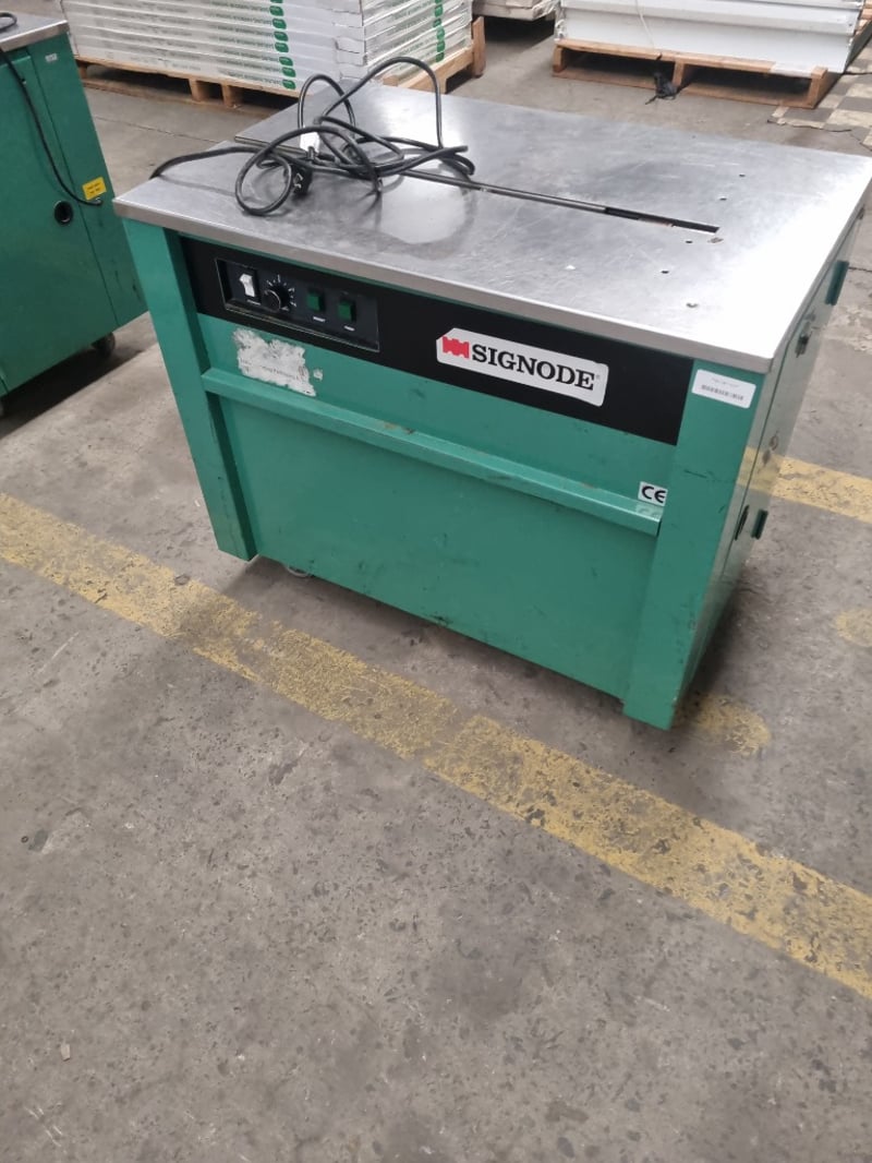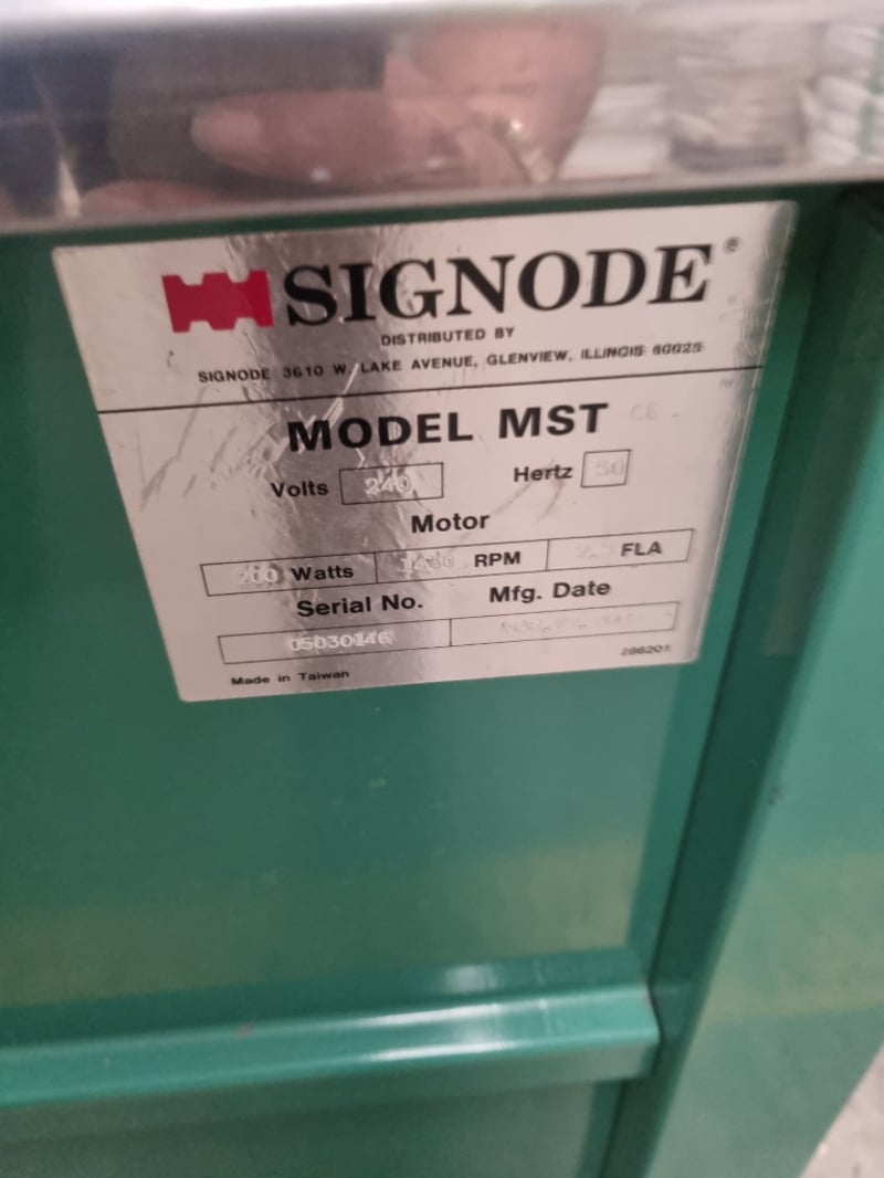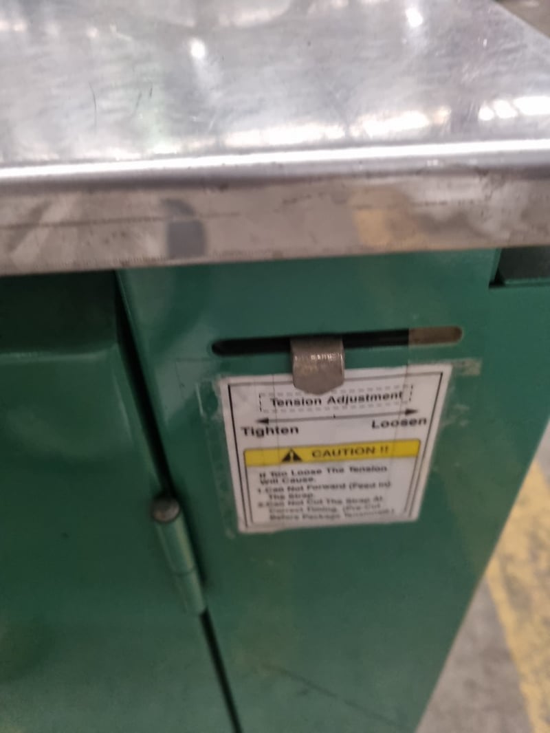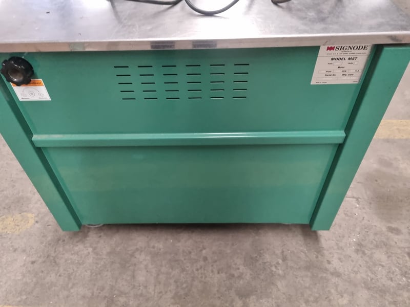 Signode Model MST strapping machine, a professional-grade semi-automatic unit designed for packaging and bundling applications. Features stainless steel top work surface with integrated feed mechanism and tensioning system. Machine includes power switch, rotary dial control knob for tension adjustment, and dual green pushbuttons for reset and feed functions. Equipped with black feed arm assembly and adjustable tension control.