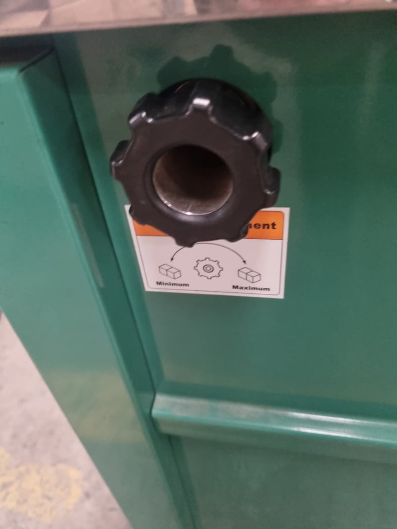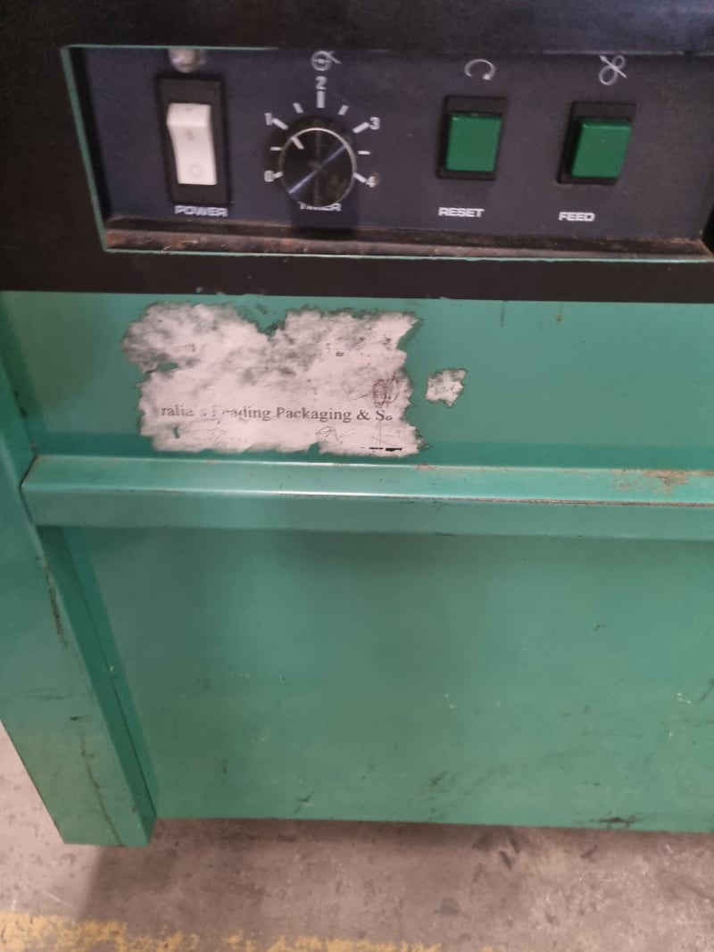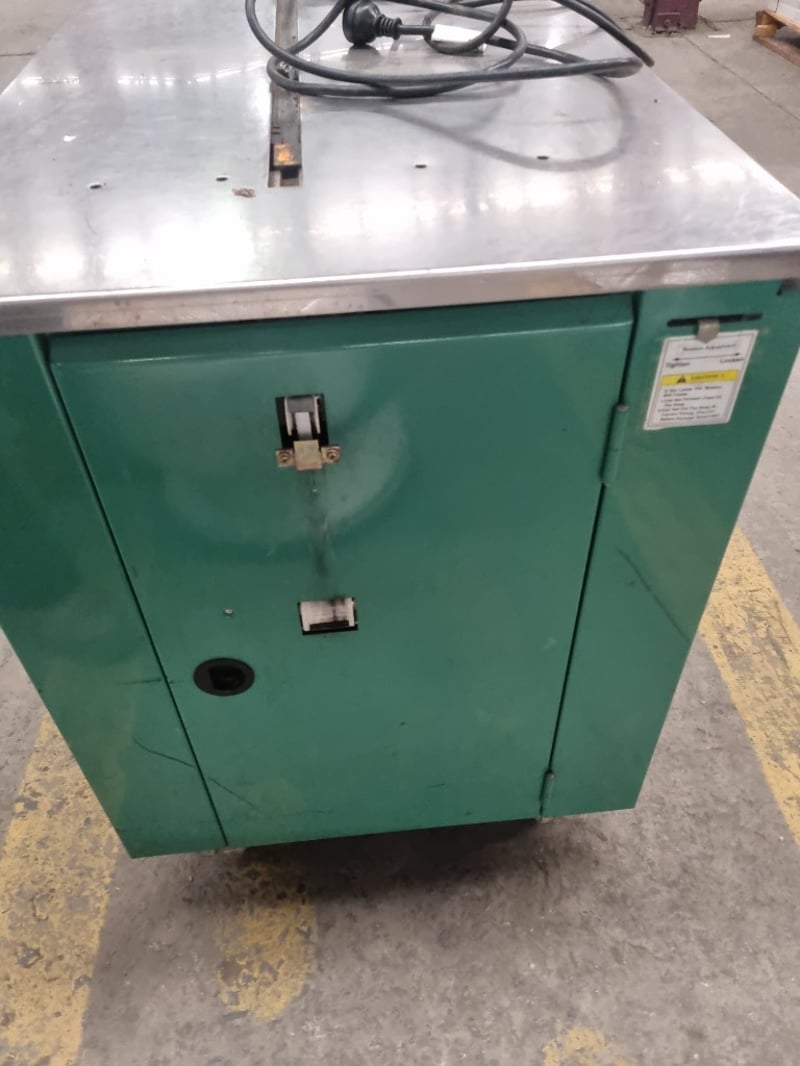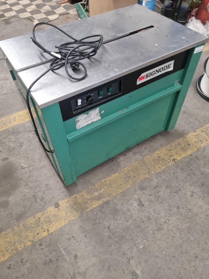 Signode Model MST strapping machine, a professional-grade semi-automatic unit designed for packaging and bundling applications. Features stainless steel top work surface with integrated feed mechanism and tensioning system. Machine includes power switch, rotary dial control knob for tension adjustment, and dual green pushbuttons for reset and feed functions. Equipped with black feed arm assembly and adjustable tension control.