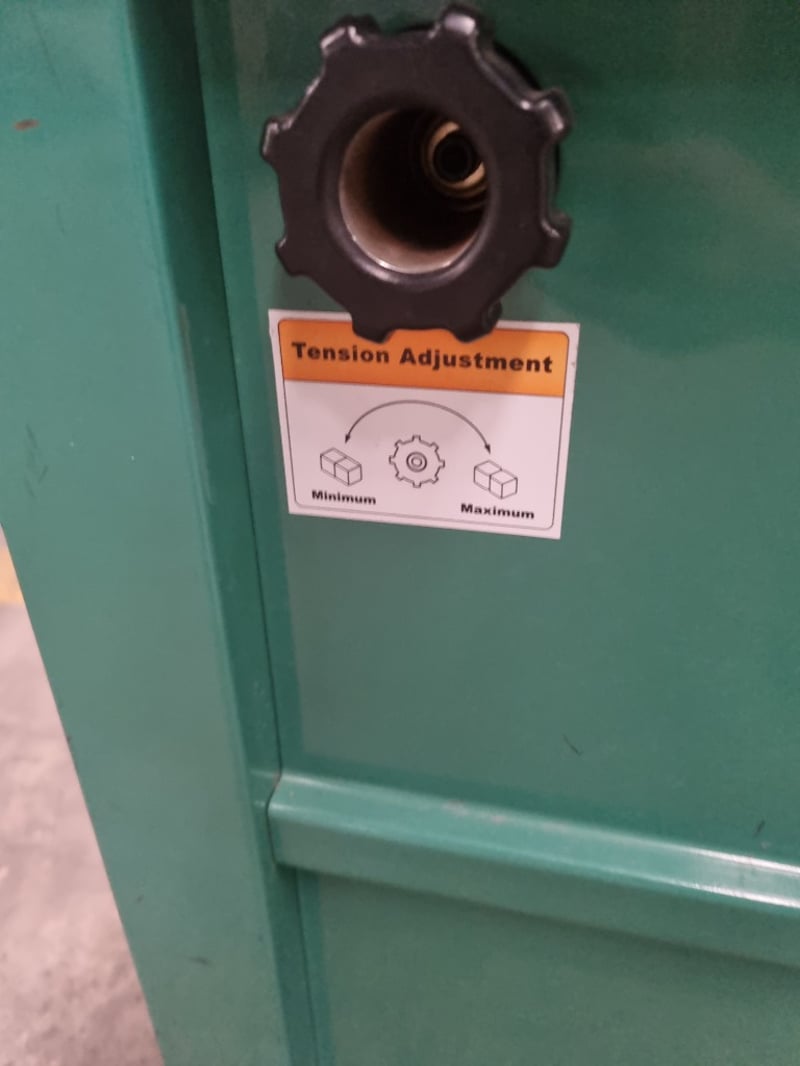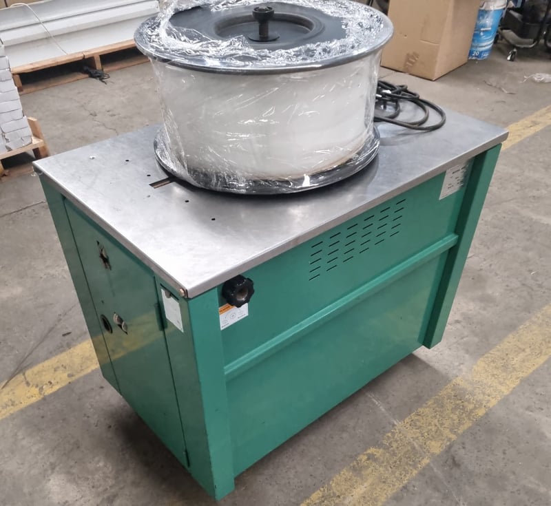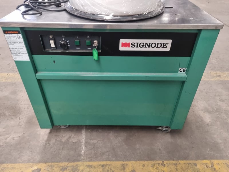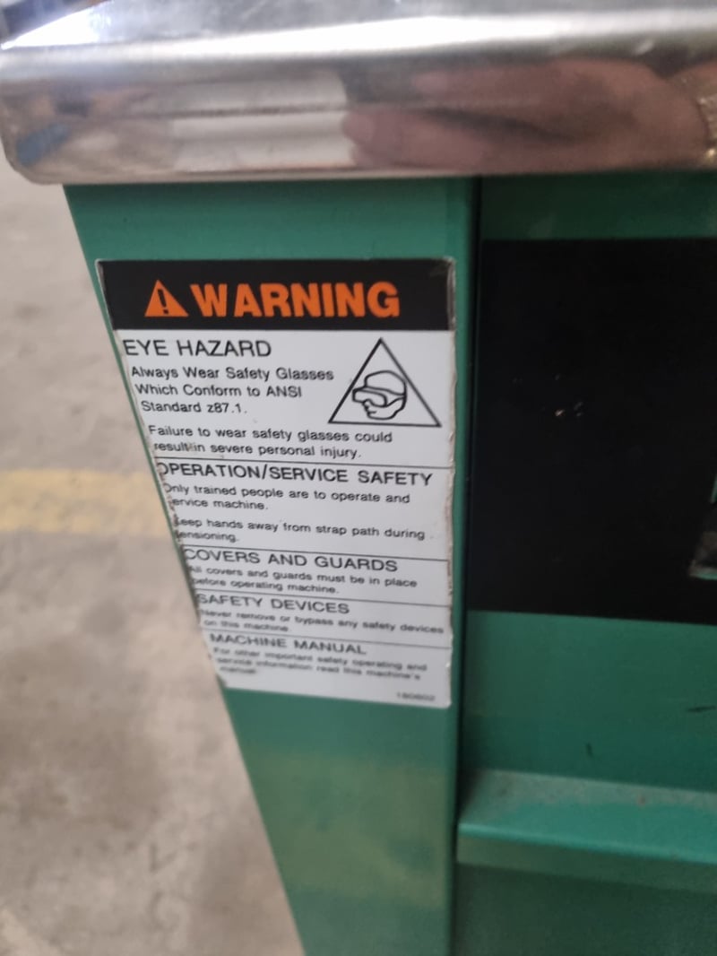 Signode Model MST strapping machine in green powder-coated steel construction. Features a 240V electric motor (200 watts, 1430 RPM) with stainless steel work surface. Includes plastic-wrapped polypropylene strapping head with adjustable tension control dial (minimum to maximum settings). Complete with power switch, reset button, feed button, and operational controls on front panel. Equipped with original power cord. Machine designed for industrial packaging and bundling applications. Note: signs of wear, untested