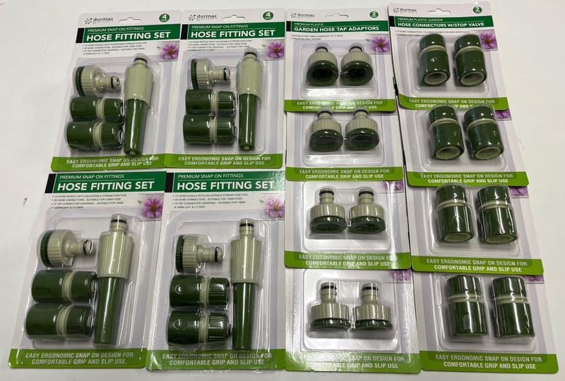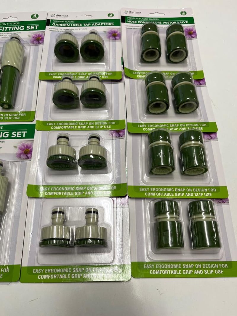 Box of Hose Fittings, all brand new, includes nozzles, connectors, tap adaptors, stopper connectors SOLD AS 1 LOT