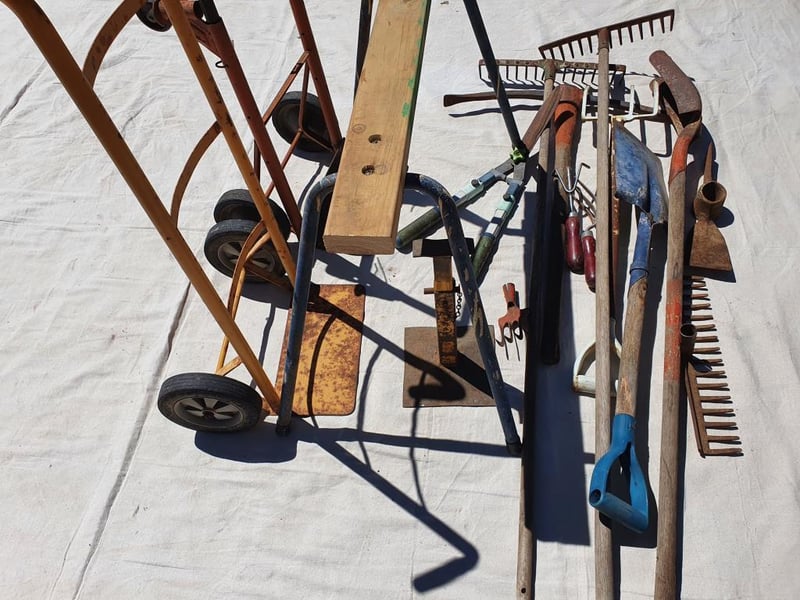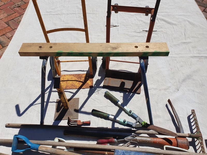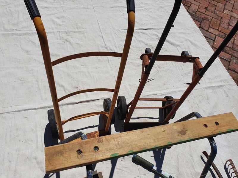 SACK TRUCKS, SAW HORSE & SHED TOOLS. Foldable saw horse, 2 x sack trucks, old shed tools etc