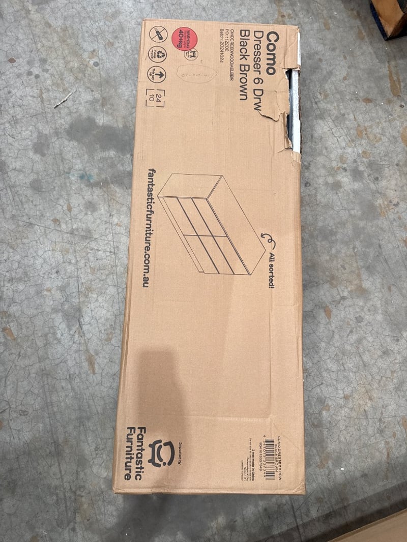 RRP; $199, Fantastic furniture Como Black Chest of 6 Drawers, model; CMODRE6DWOOOMELBBRdimensions approx; L 120cm x D 39cm x H 73cm