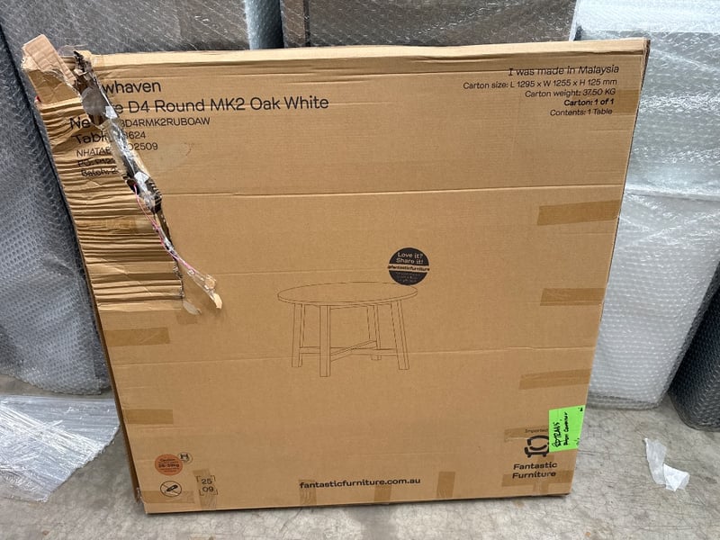 RRP; $399, Fantastic furniture Newhaven 4 Seater White & Oak Round Dining Table, model; NHATABD4RMK2RUBOAW