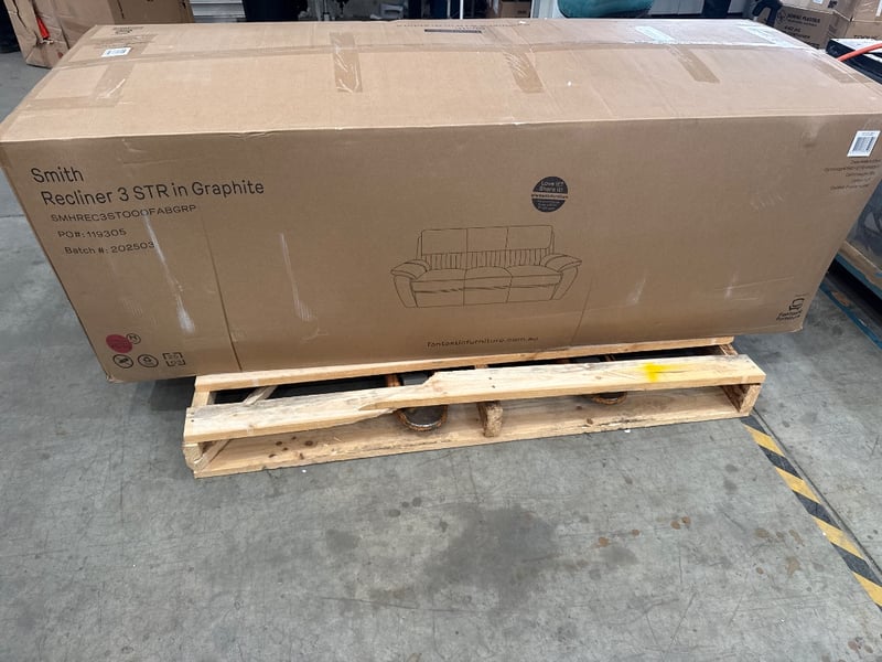RRP; $999, Fantastic furniture Smith 3 Seater Graphite Recliner Sofa, model; SMHREC3STOOOFABGRP