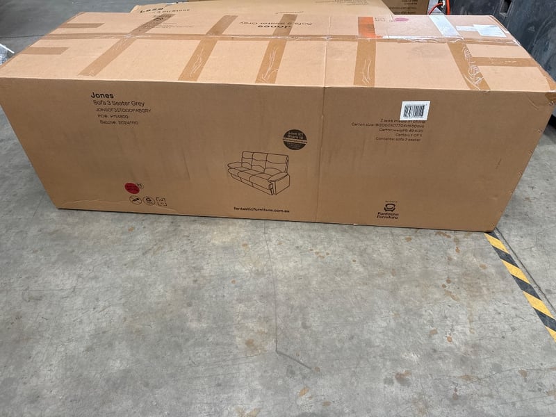 RRP; $699, Fantastic furniture Jones 3 Seater Grey Sofa, Model; JONSOF3STOOOFABGRYdimensions approx; L 203cm x D 99cm x H 99cm