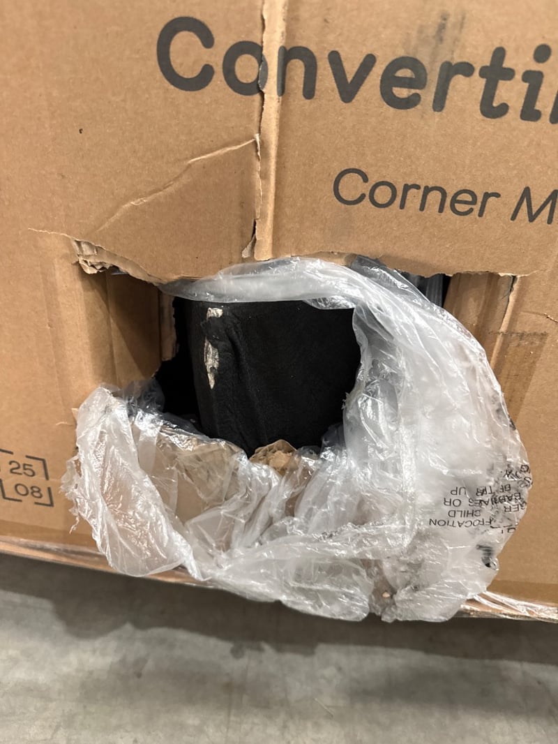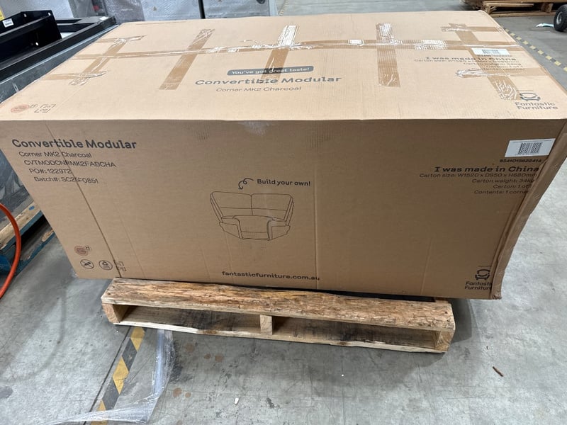 RRP; $599, Fantastic furniture charcoal Convertible Modular Corner Piece, Model; CVTMODCNRMK2FABCHA, fabric appears ripped