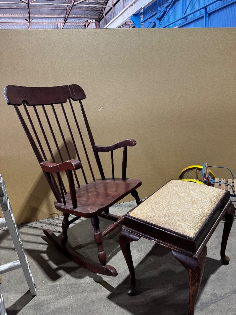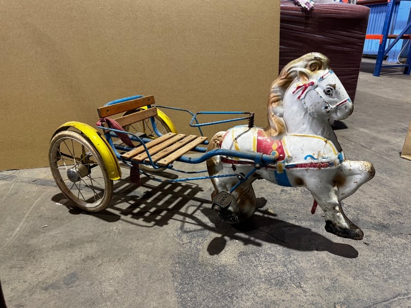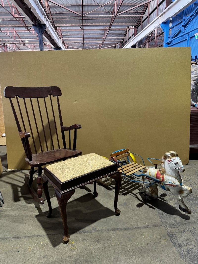 Homewares, homewares including Mobo Pony Express pedal toy horse and a timber style rocking chair with foot stoolCondition unknown, inspection recommended Sold as lot