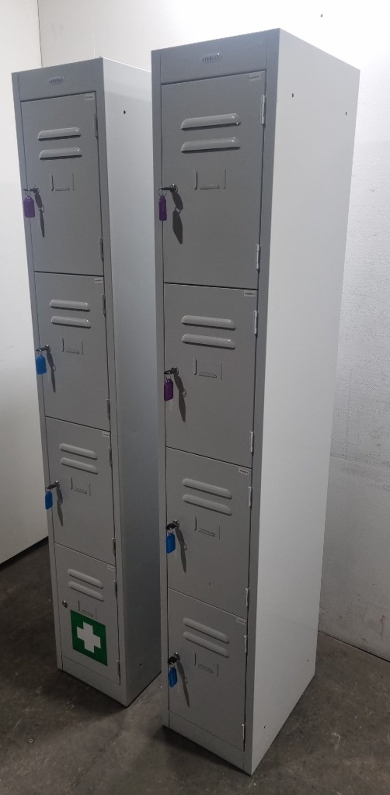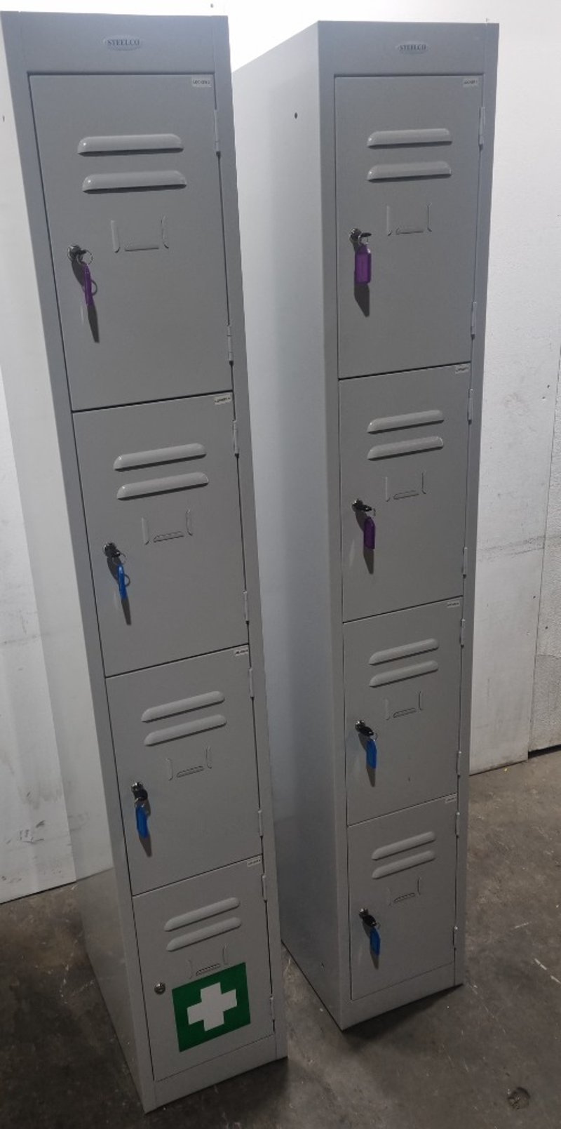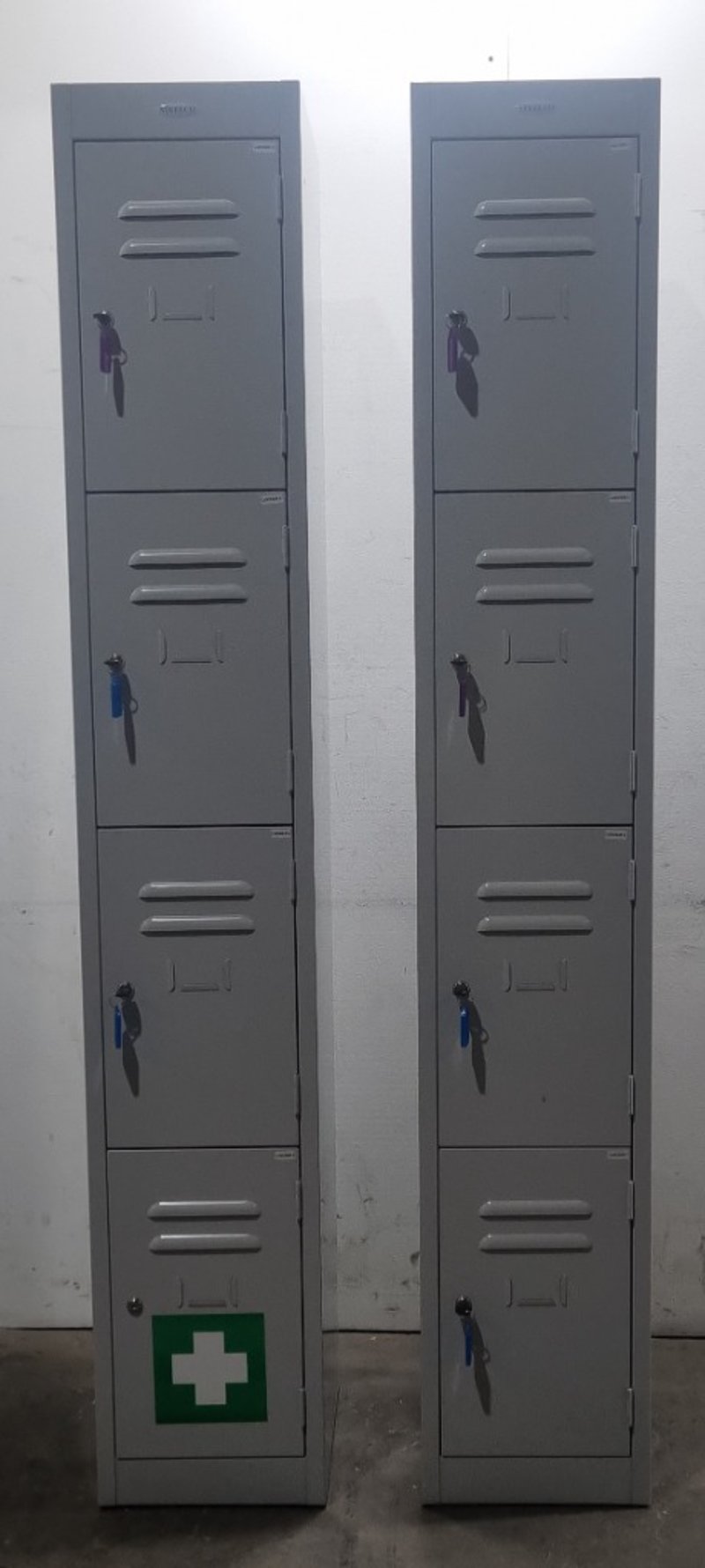 Storage locker x 2 , vertical, steel, 4 x compartments.Includes keys. Dims: 183x60x30cm Sold as lot Note : signs of wear