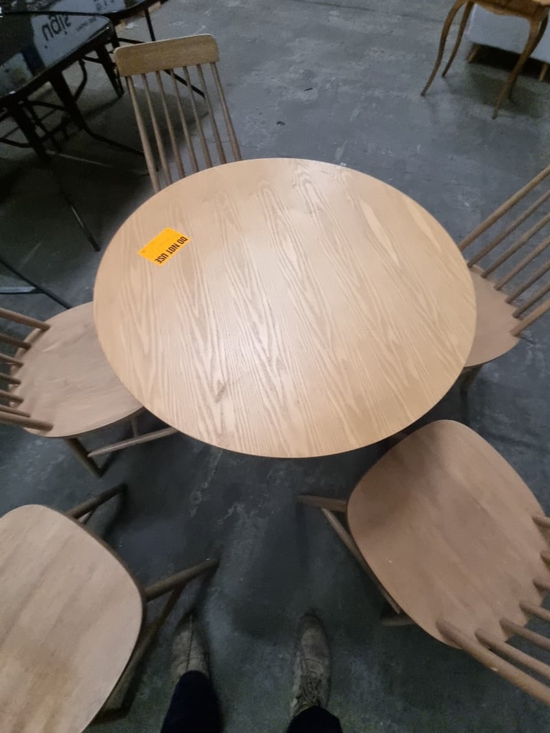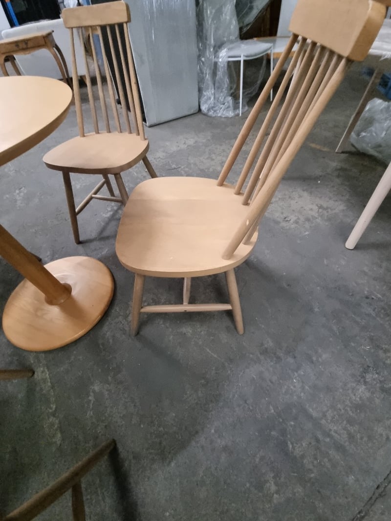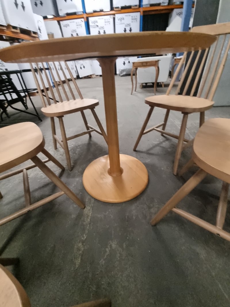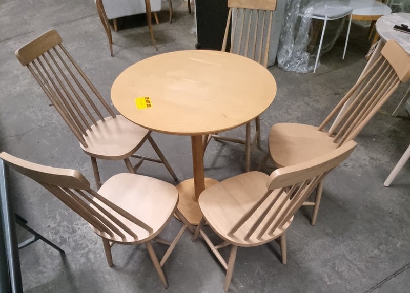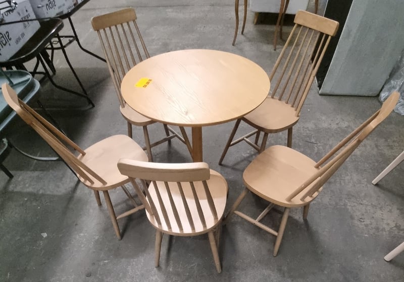 Round wooden dining table paired with five matching spindle-back chairs.