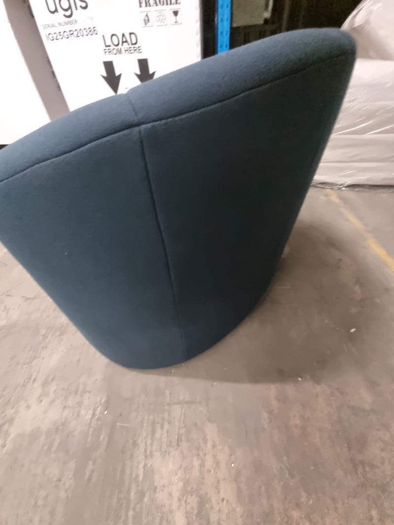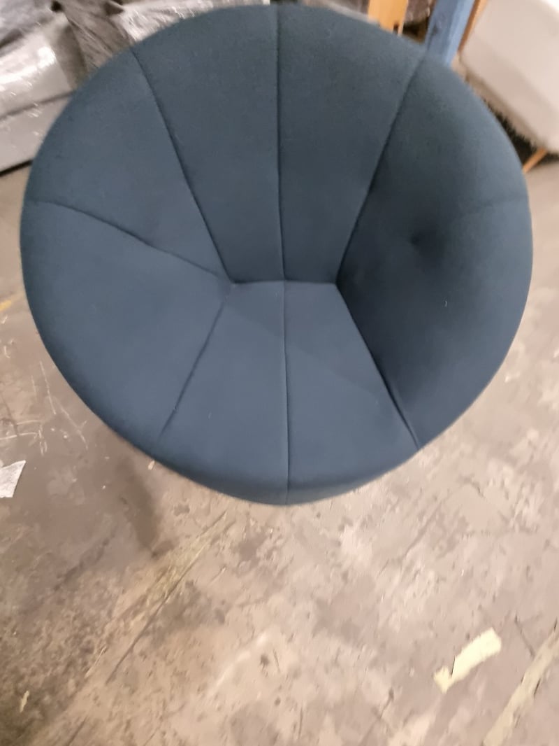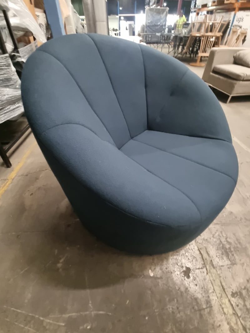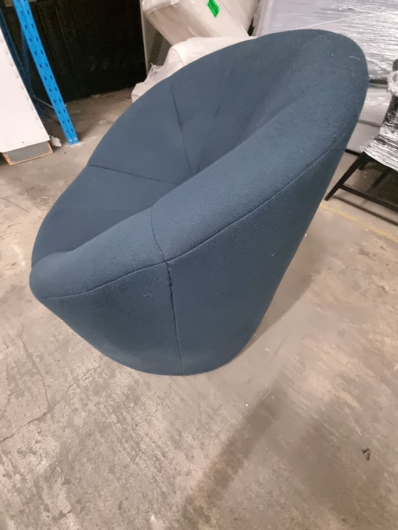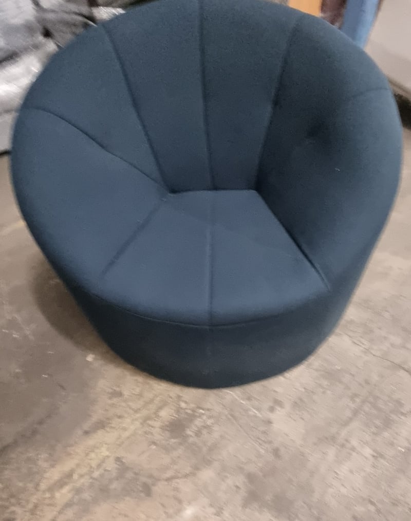 Pumpkin armchair upholstered in a blue fabric. Dims: 85cm H, 95cm W, 100cm HNote: signs of wear.