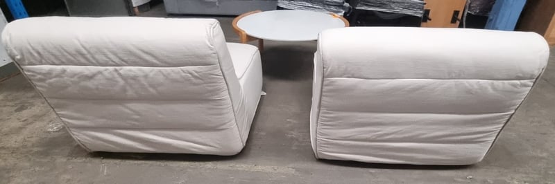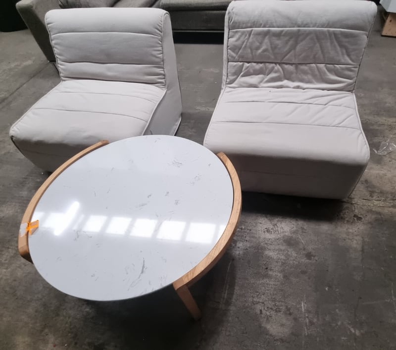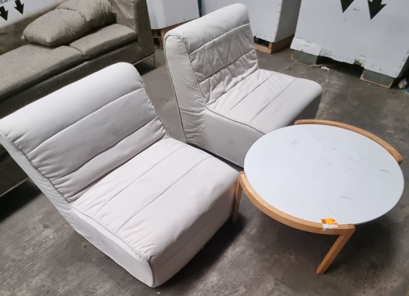 Pair of armless fabric lounge chairs with a round wooden side table.