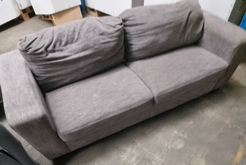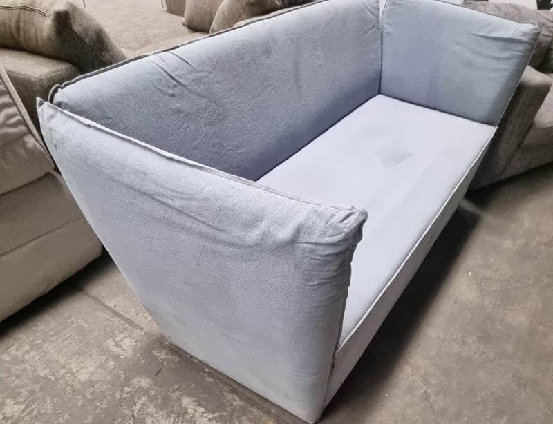 Light blue fabric sofa and grey fabric two-seater sofa.Blue sofa Dims: 190cm L, 75cm W, 80cm H Grey sofa dims: 225cm L, 95cm W, 58cm HSold as a lot.Note: signs of wear.