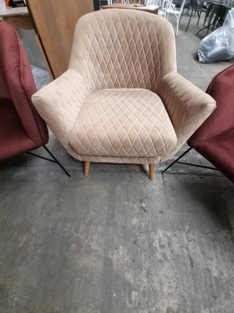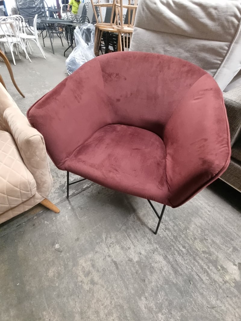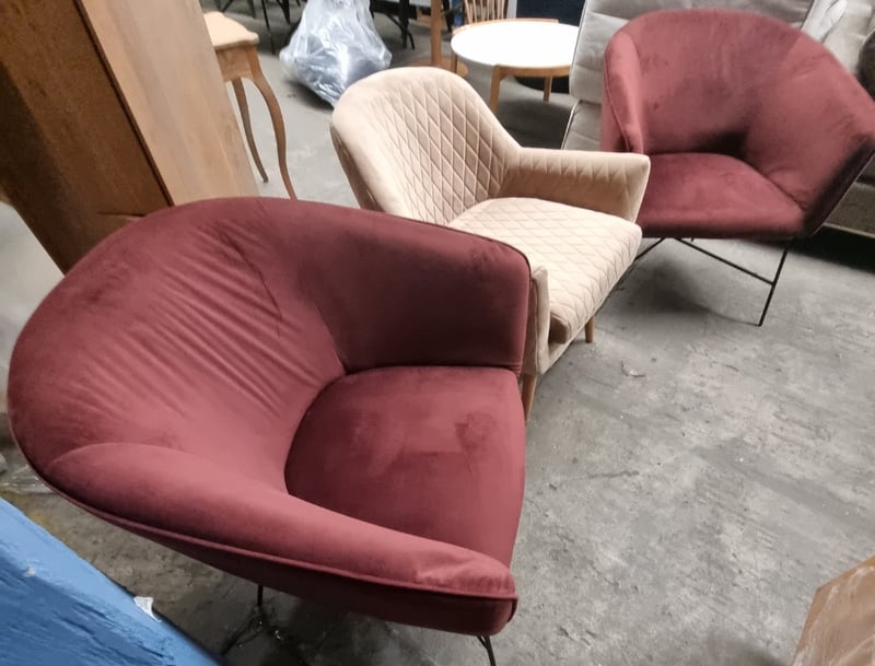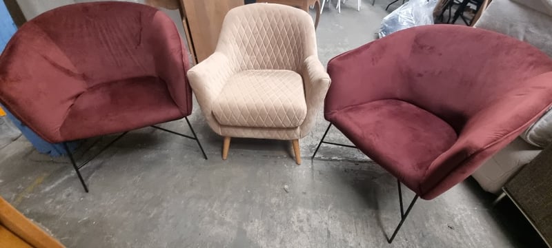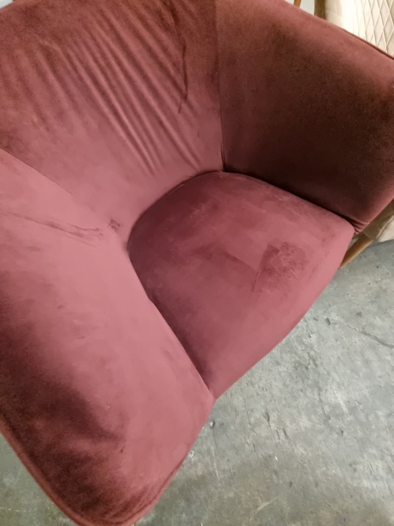 Velvet occasional accent chairs.Dims: 80cm H, 75cm L, 80cm WNote: signs of wear.
