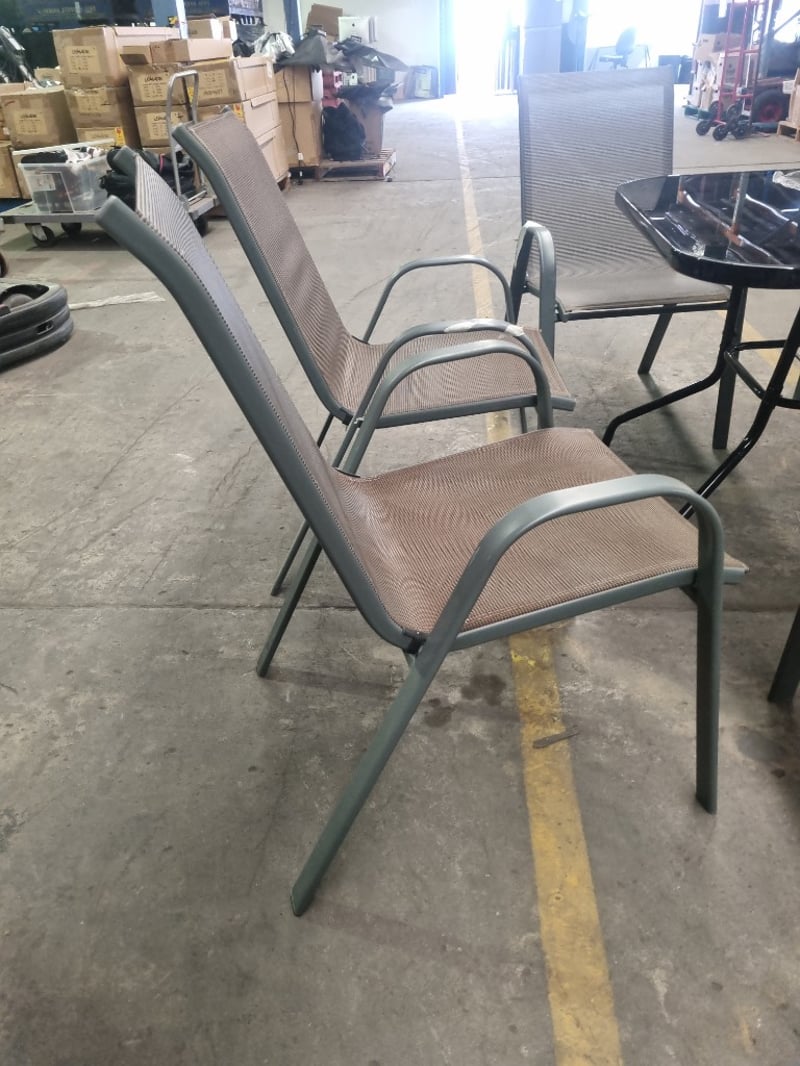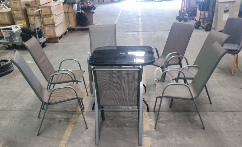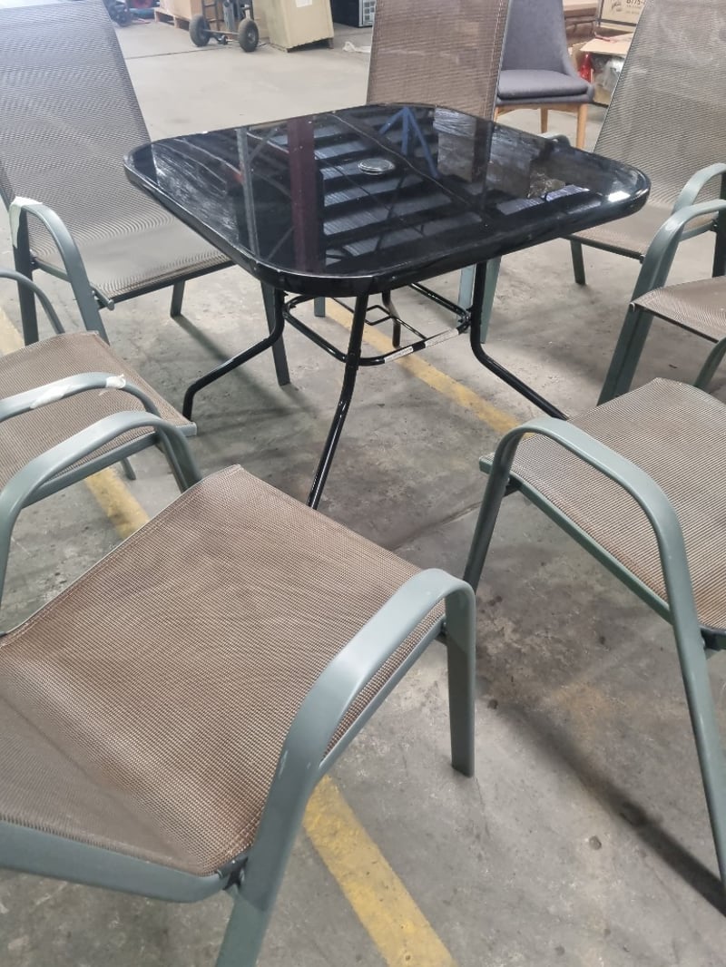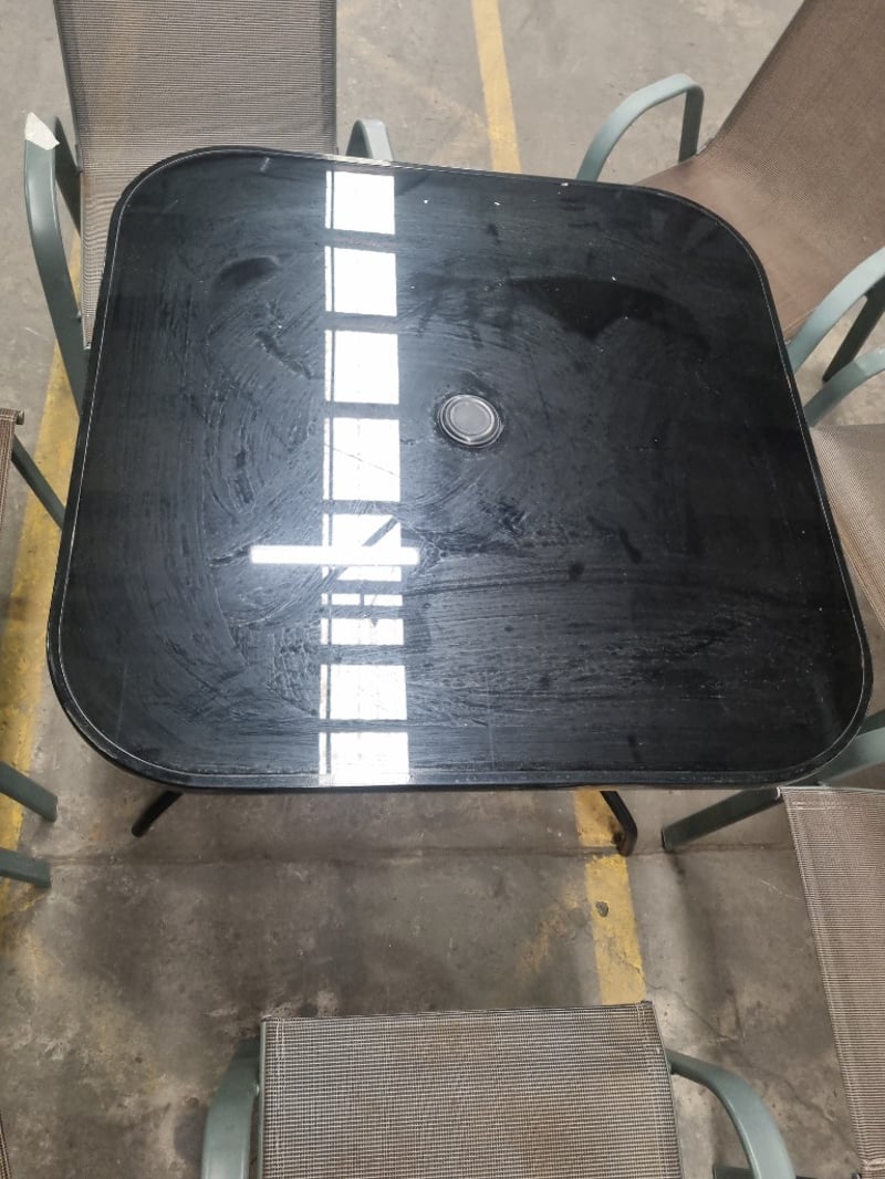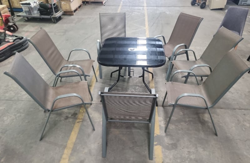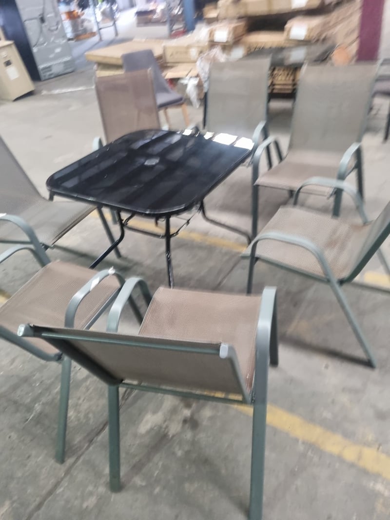 Garden furniture set including a black glass table and seven brown steel and textilene chairs. Chair Dims: 56cm L, 75cm W, 100cm H Table Dims: 88cm L, 88cm W, 73cm H Sold as a lot.