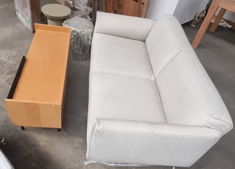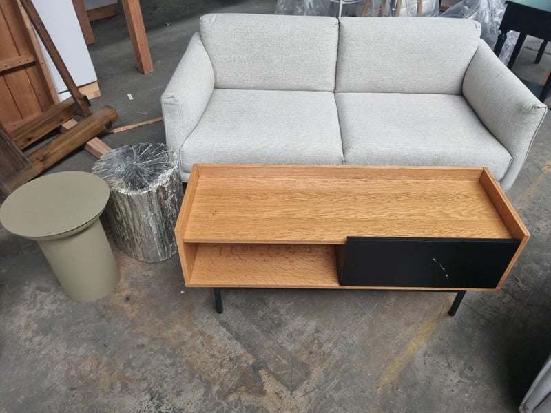 Assorted furniture including, TV stand, a two-seater sofa, a round side table, and a unique tree stump accent table.