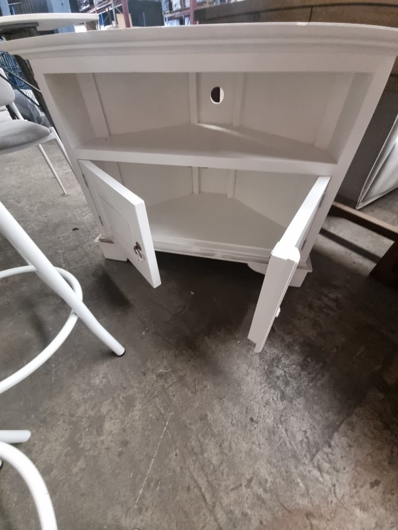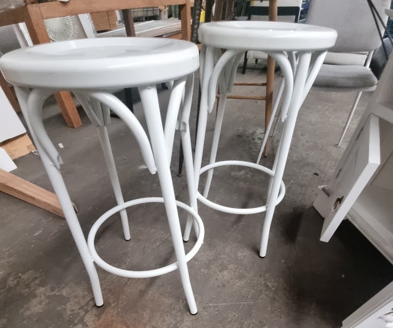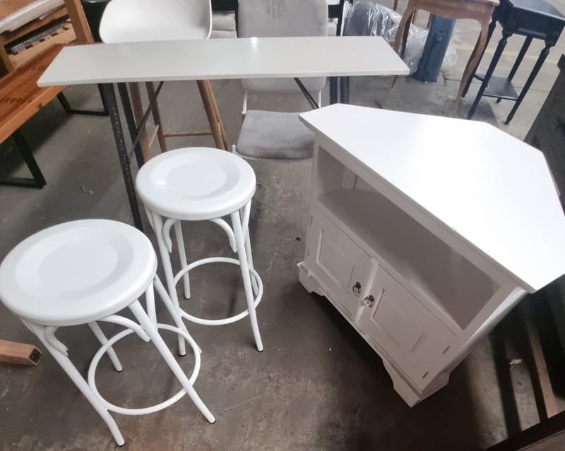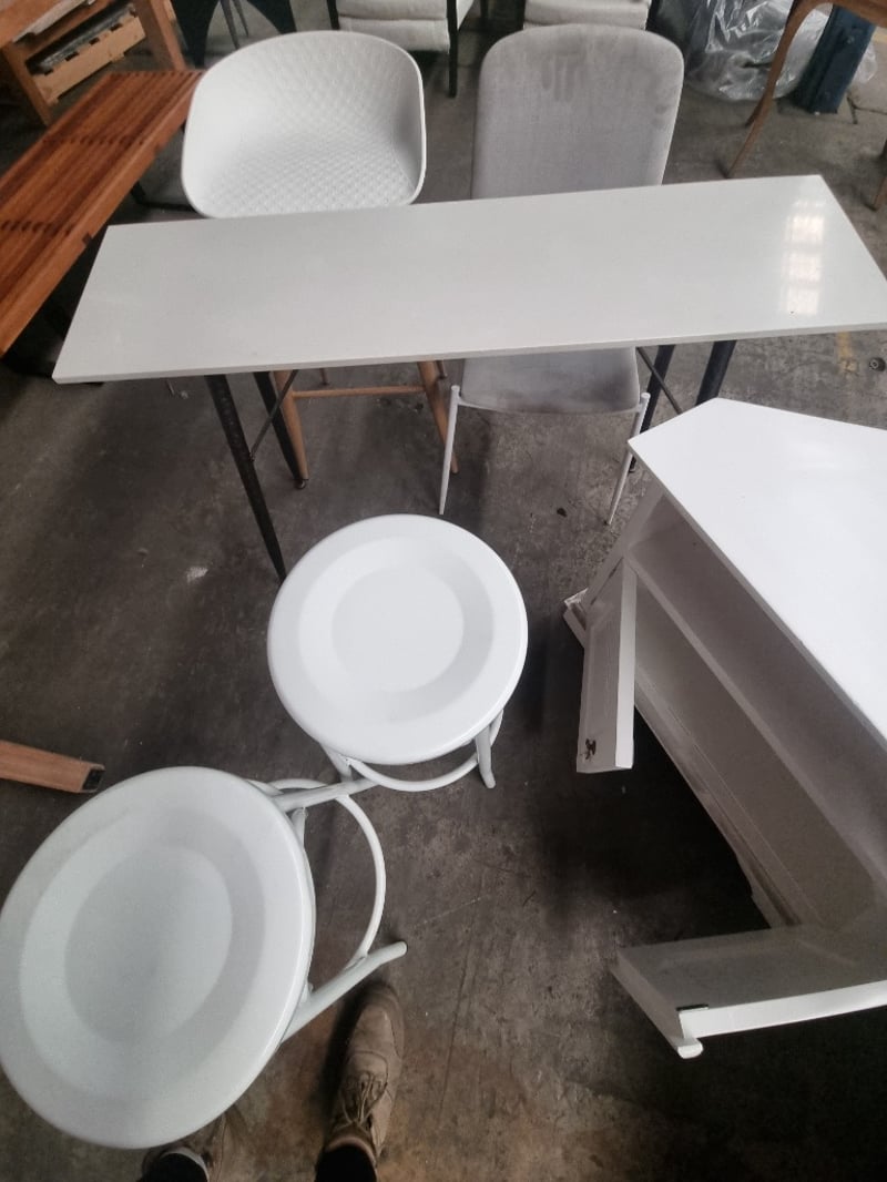 Assorted white furniture items, including two metal-framed bar stools, a long table, chairs, and a corner cabinet.Table Dims: 120 cm L, 35cm W, 78cm HCabinet Dims: 90cm L, 50cm W, 70cm HStool Dims: 35cm L, 35cm W, 65cm HSold as a lot.Note: signs of wear.