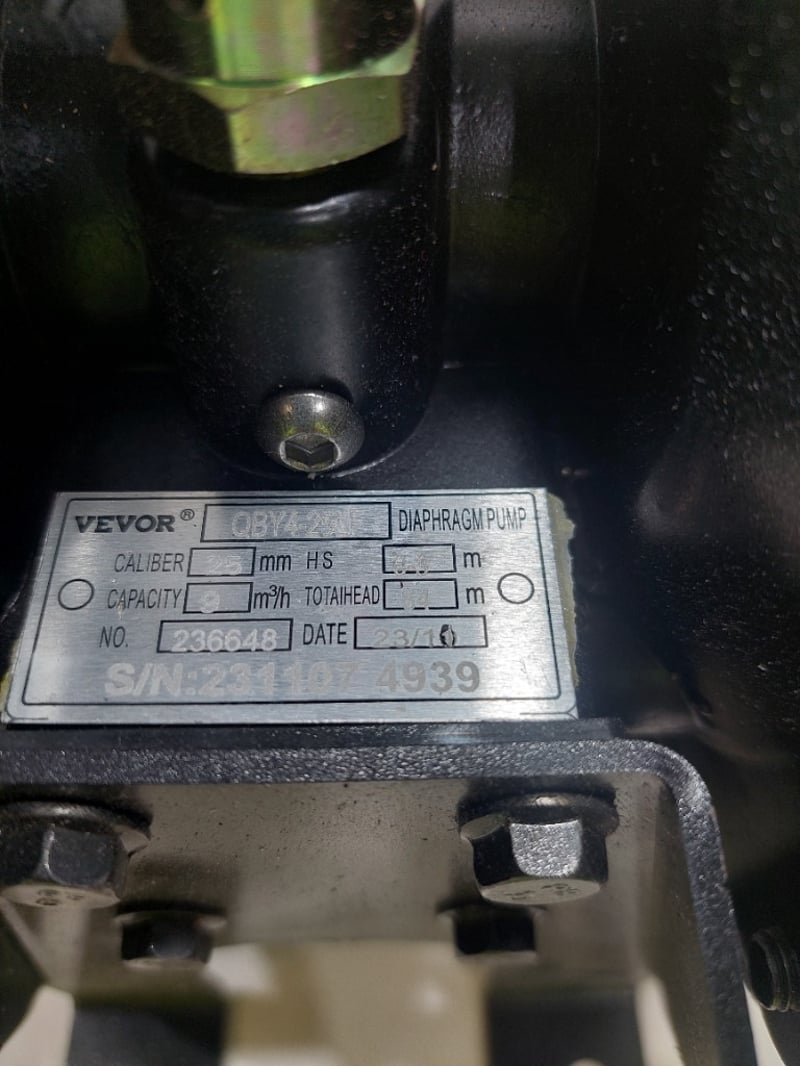 Vevor diaphragm pump. Model: B25LF. Serial no: 231107 4939. Notes: item untested and signs of wear. Dims: 31cm H, 21cm W, 22cm D. Notes: item untested and signs of wear.