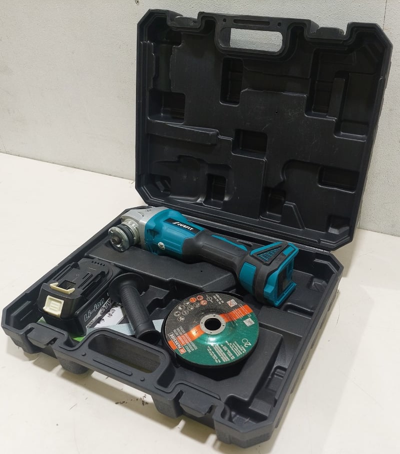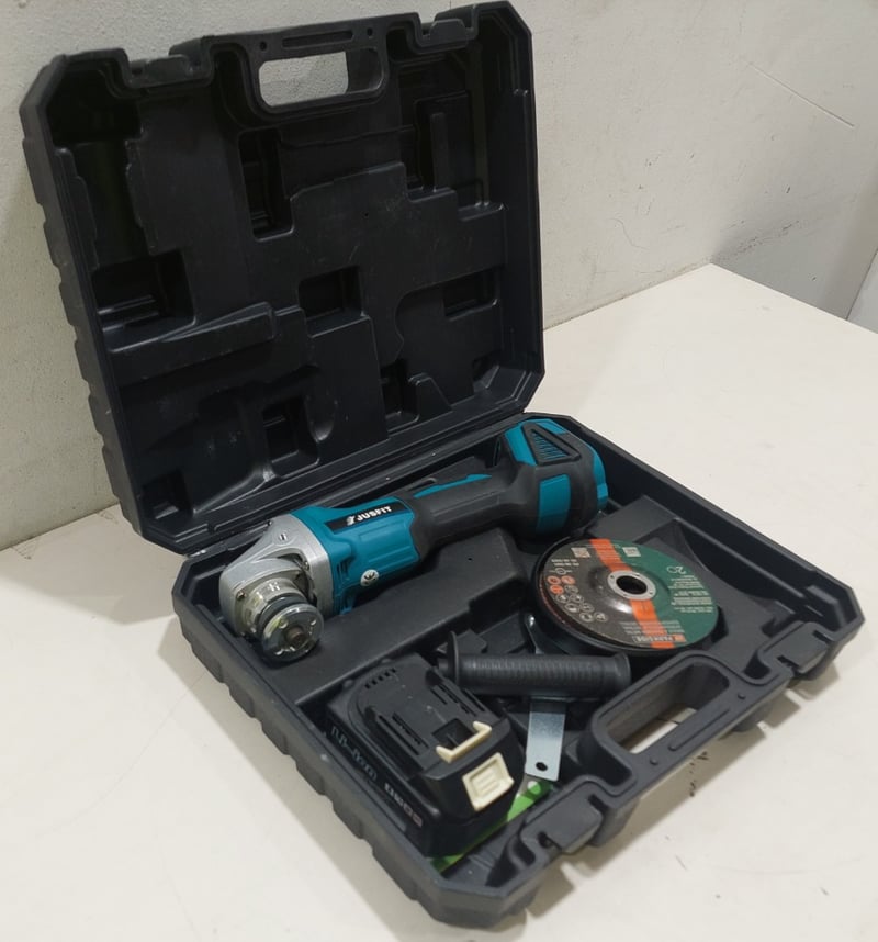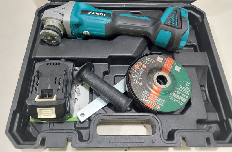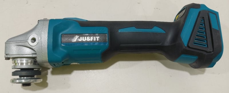 Jusfit cordless brushless angle grinder.Notes: item untested and signs of wear and may have pieces missing.