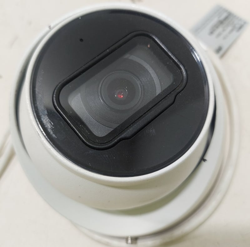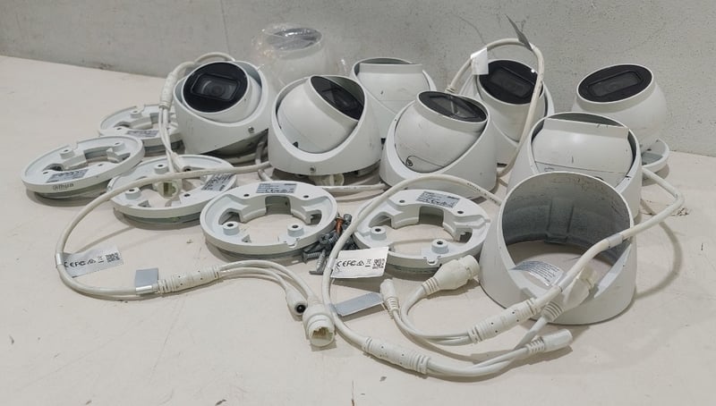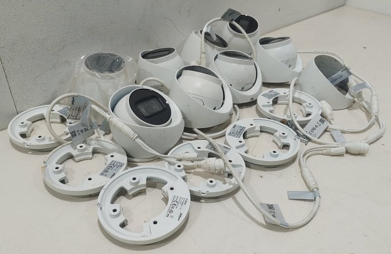 Turret style network security cameras, White, includes mounting adapter plates. Sold as a lot. Notes: items untested and signs of wear.