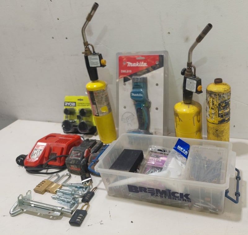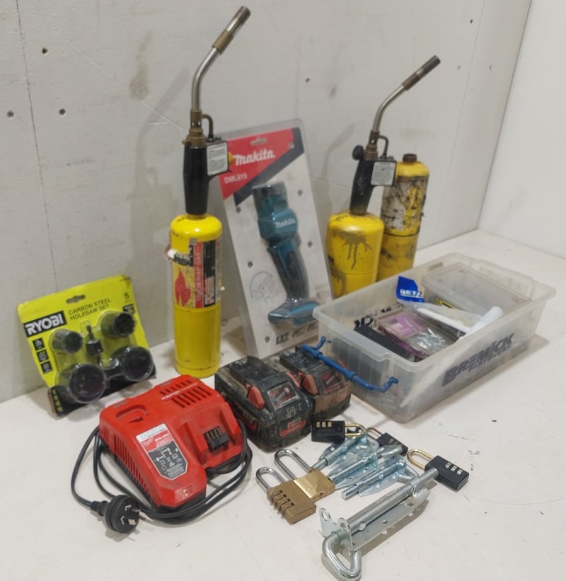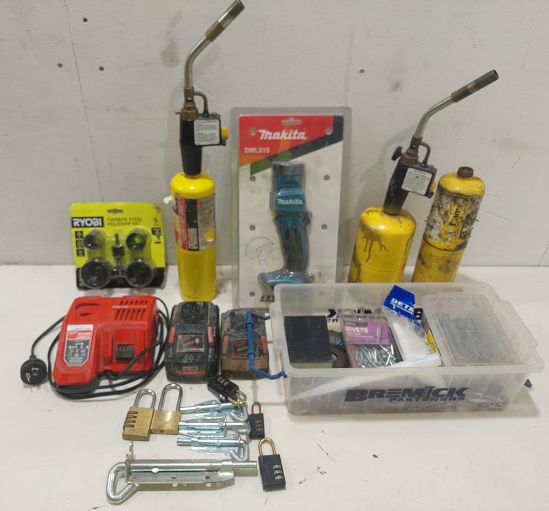 Assorted lot includes,Makita led torch, model:DML815.Milwaukee rapid battery charger and batteries Bernzomatic MAP-PRO gas cylinders with torch heads. Model:TS8000 and more...Sold as a lot.Notes: items untested and signs of wear.