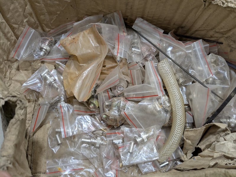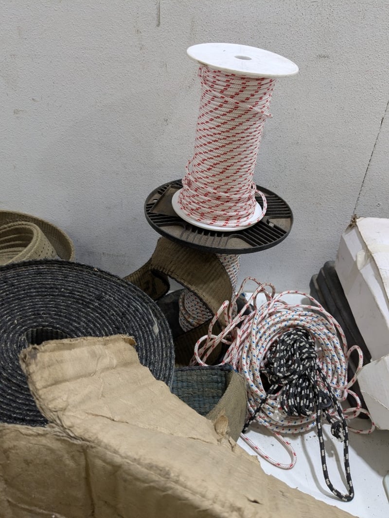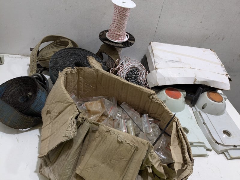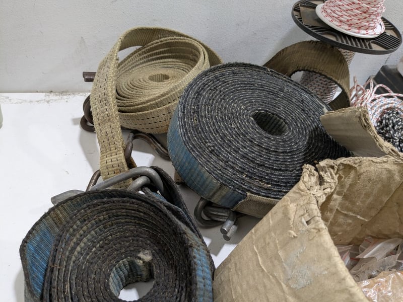 Assorted items including heavy-duty ratchet tie-down straps, plastic toolbox filled with various Allen keys and more..