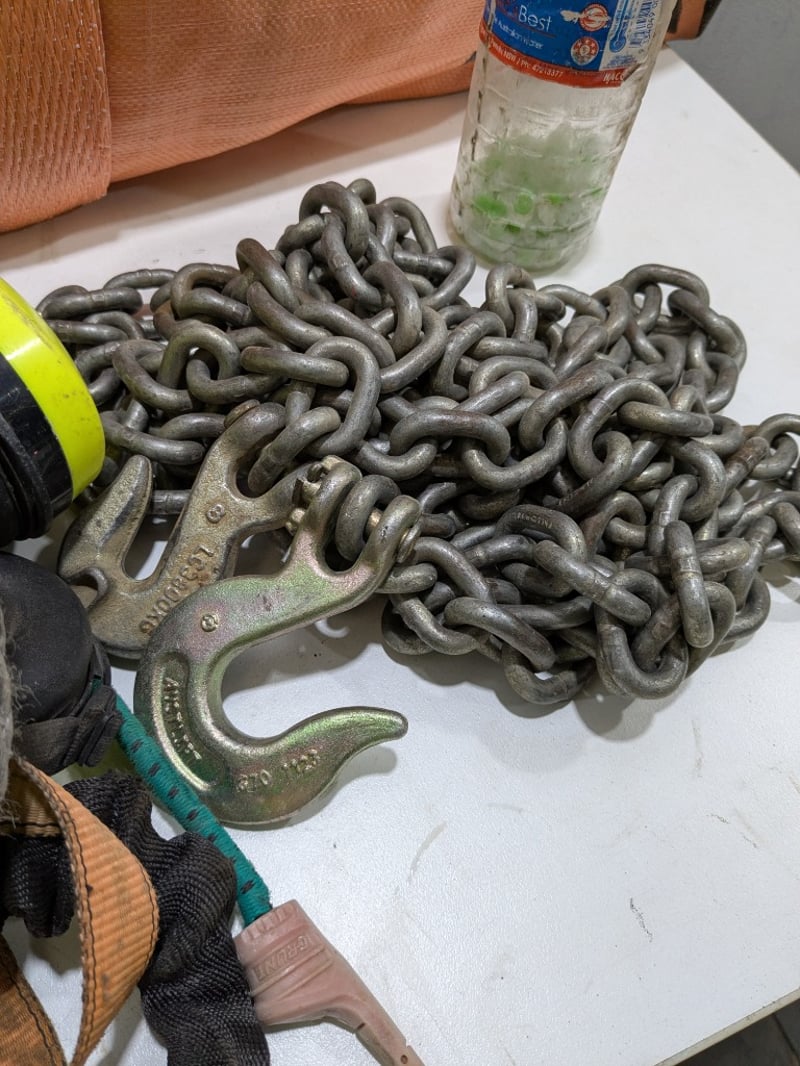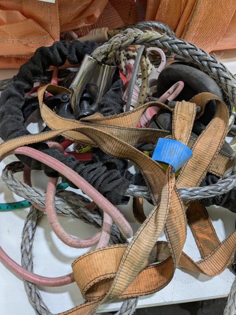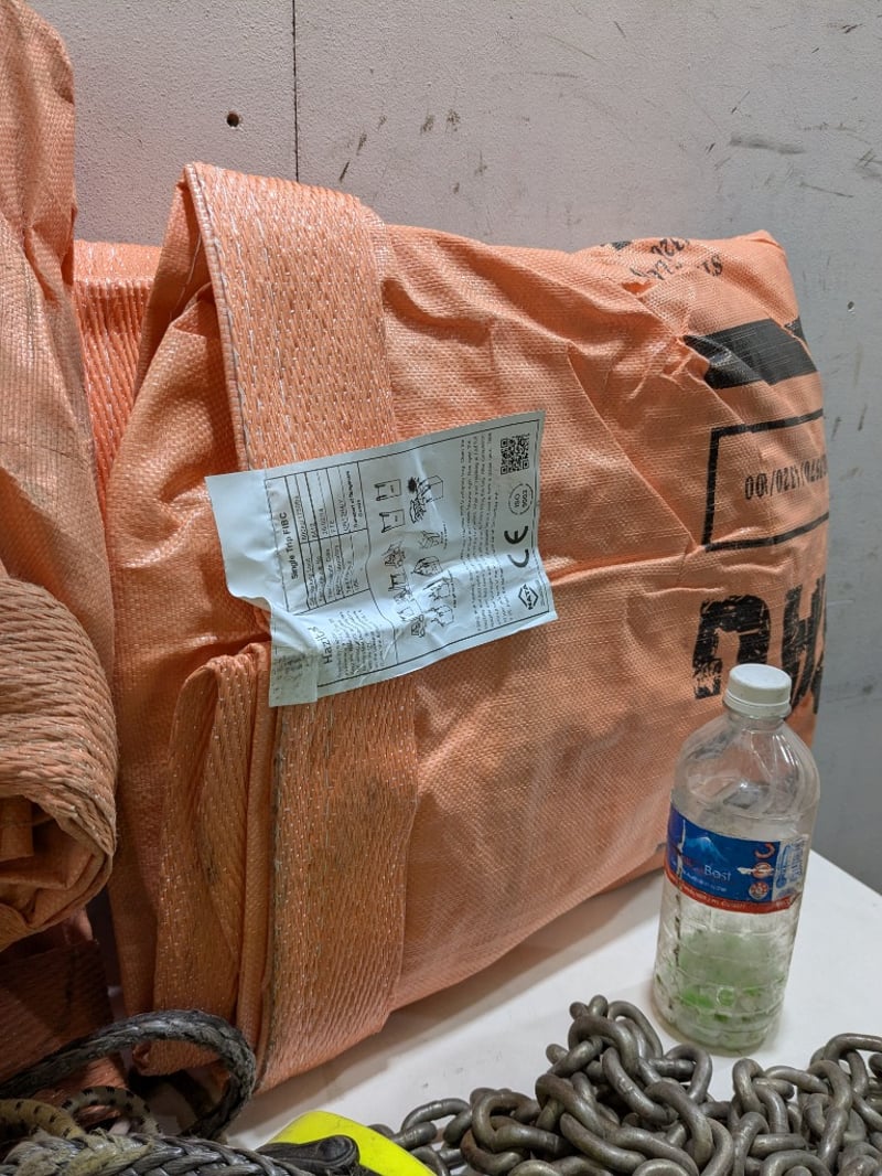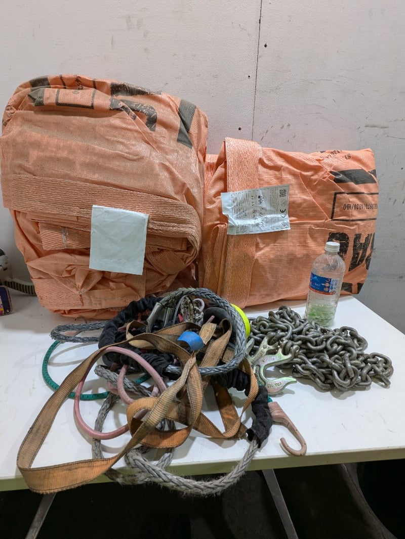 Assorted items including heavy-duty steel tow, orange synthetic round lifting sling and more...Note: Signs of wear and tearSold as a lot.