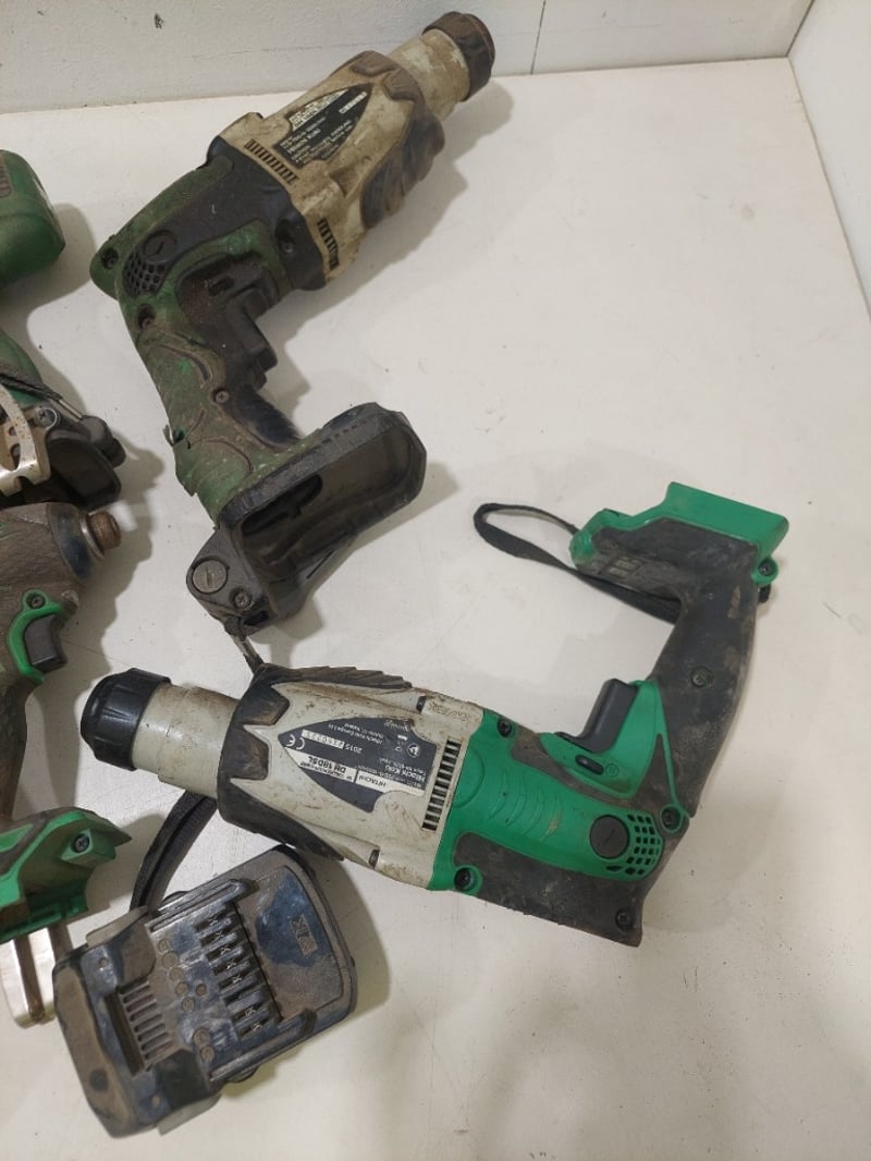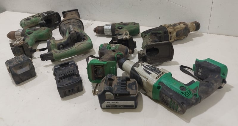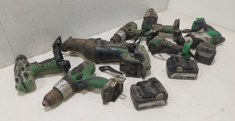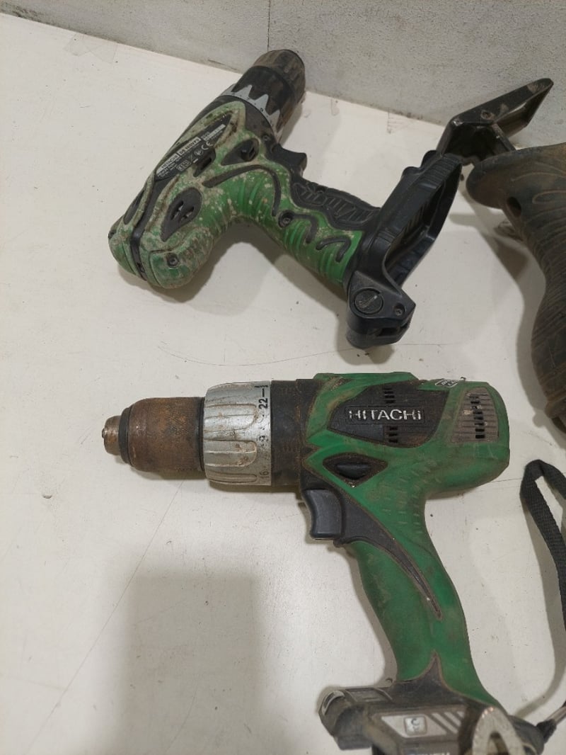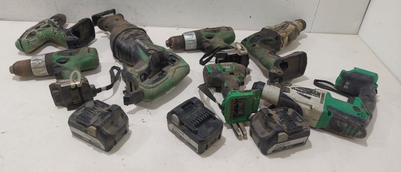 Assorted Hitachi power drills various sizes and voltages.