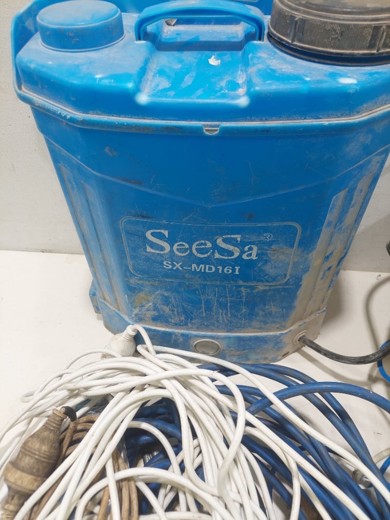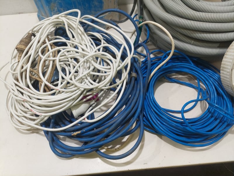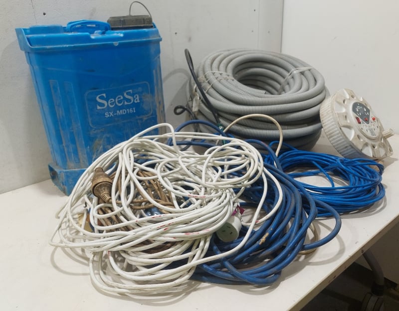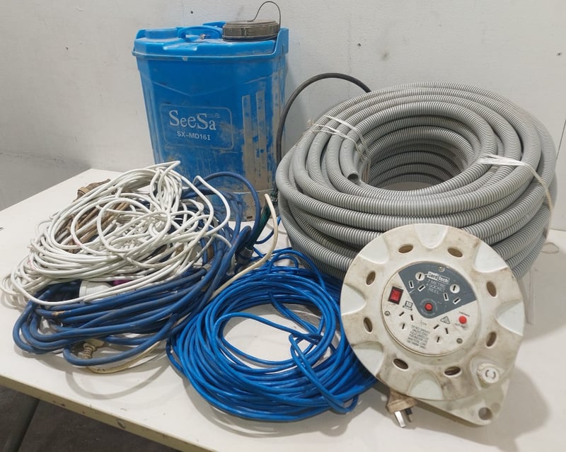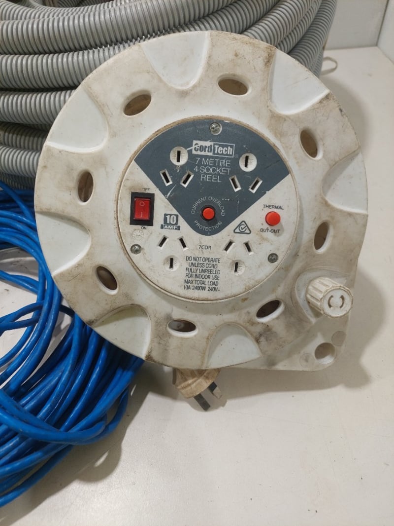 Assorted lot includes, power cords,socket reel, SeeSa SX-MD161 storage can and more...
