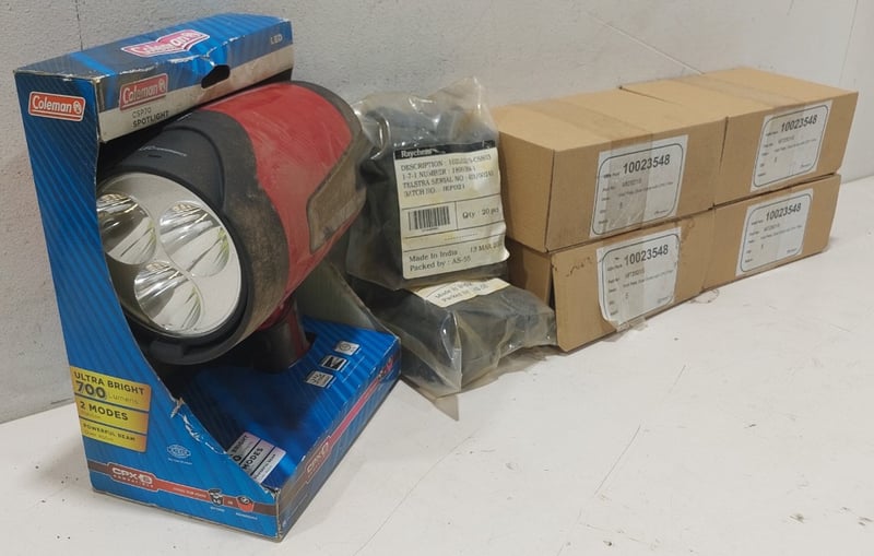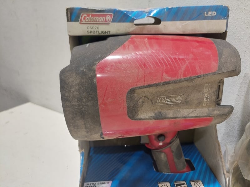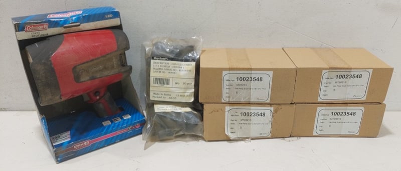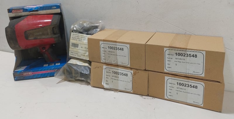 Assorted lot includes, Coleman LED spotlight,Model:CSP70, Wall plate,dual outlet with CPU filter and more...Sold as a lot.Notes: items untested and signs of wear.
