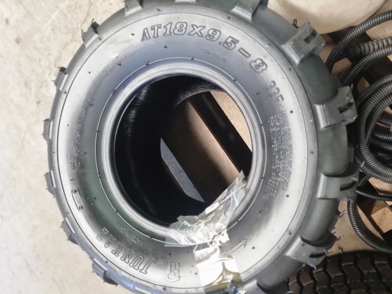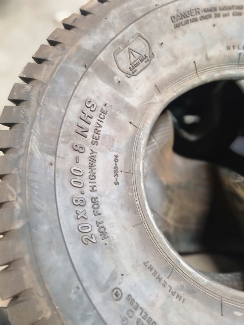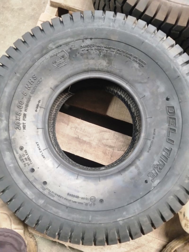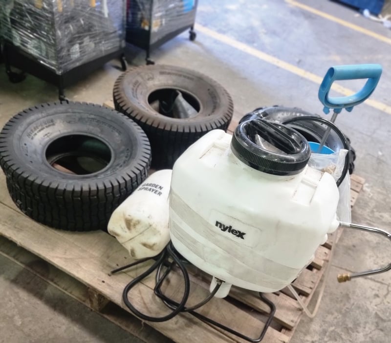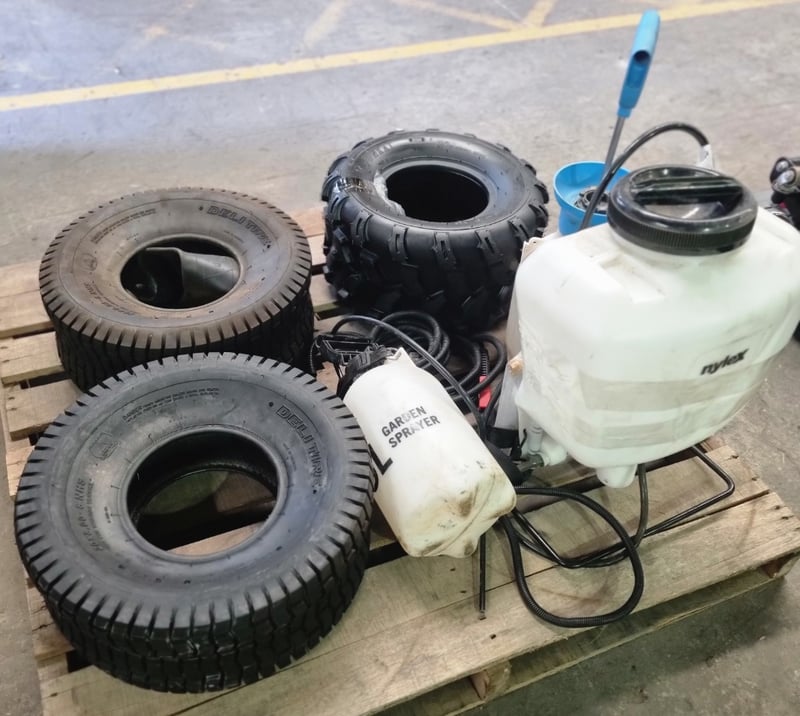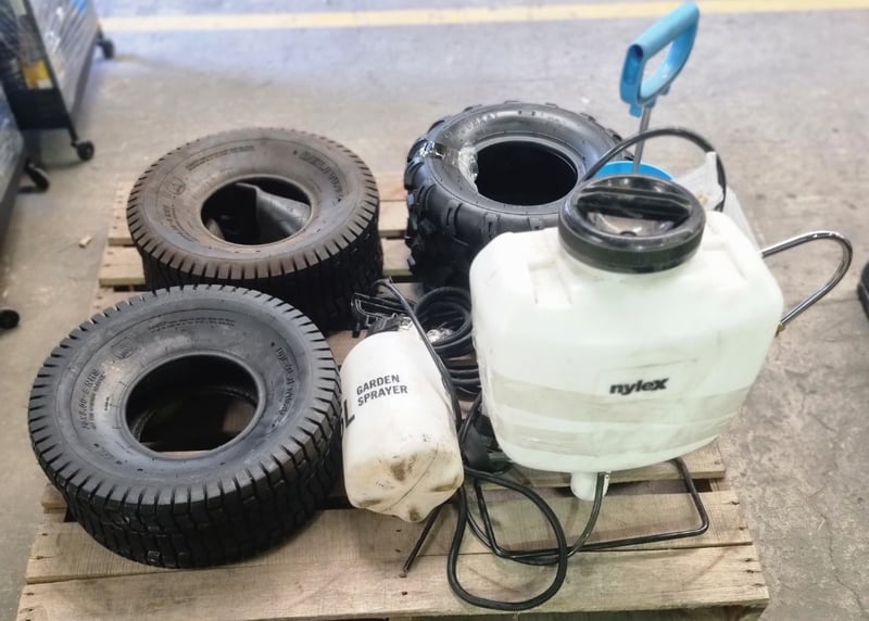 Lot comprises used agricultural and industrial tyres with garden spraying equipment. Includes three black tyres (two marked 20x8.00-8 NHS "Not for Highway Service" Delityre brand, one marked AT18x9.5-8 38F).