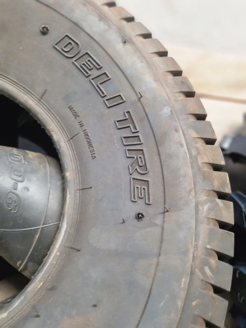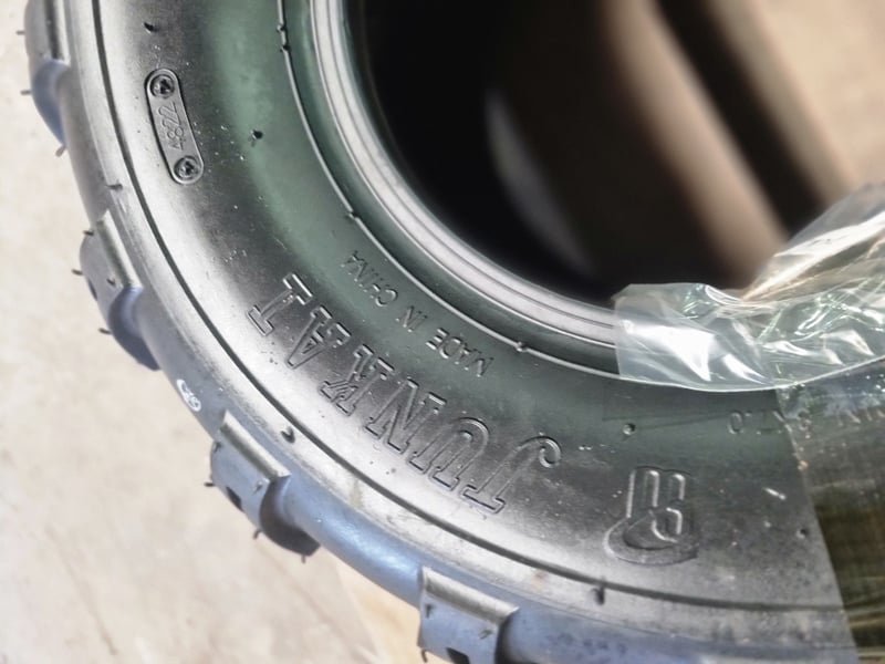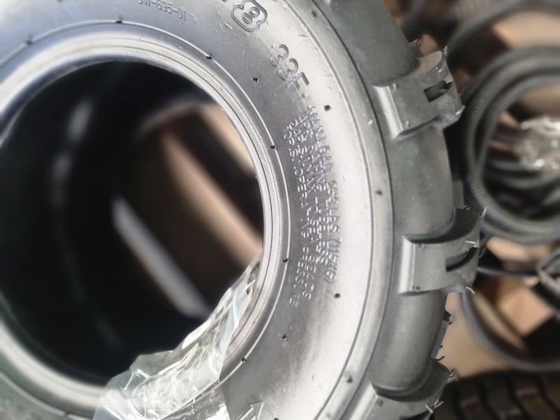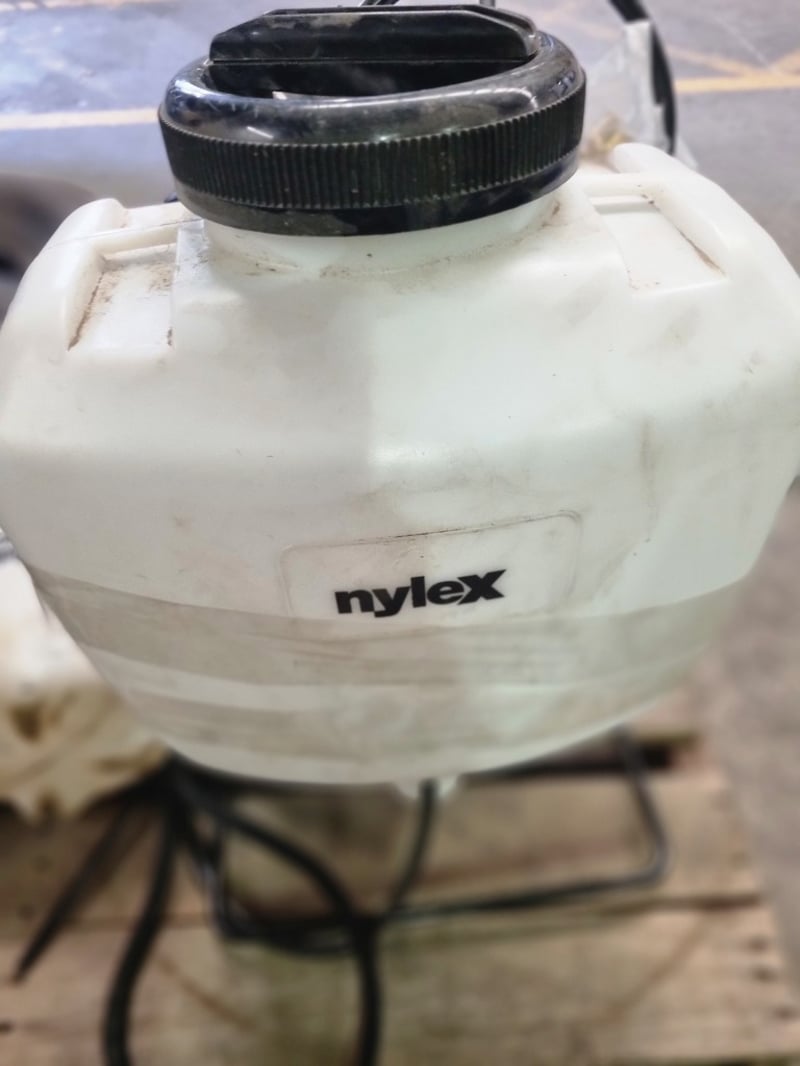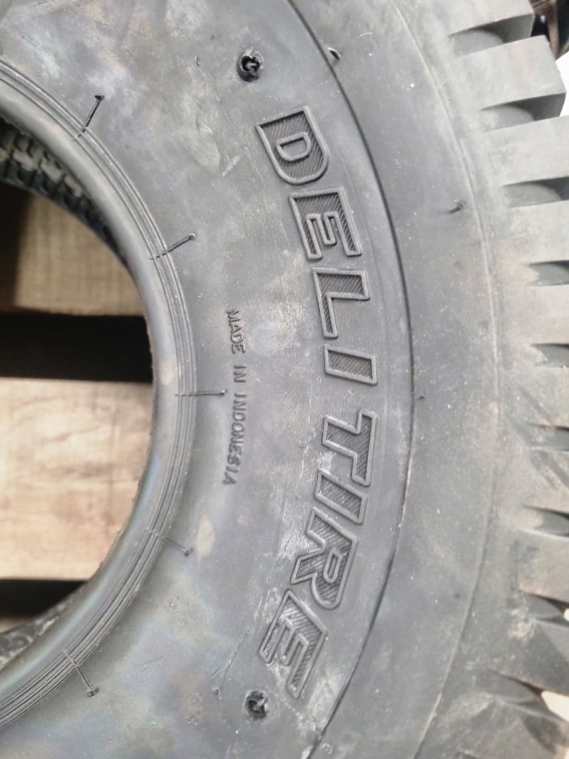 Lot comprises used agricultural and industrial tyres with garden spraying equipment. Includes three black tyres (two marked 20x8.00-8 NHS "Not for Highway Service" Delityre brand, one marked AT18x9.5-8 38F).